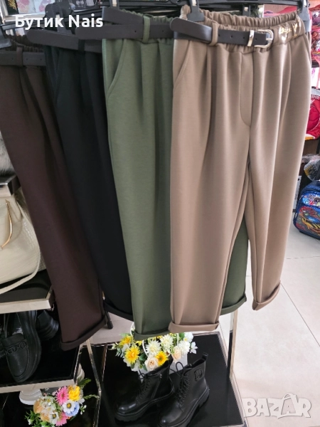 Нов модел удобен стилен и красив панталон! Модела е с ластик на кръста и това позволява да се носи от различни размери,талия и ханш!Акцентиран с кожен колан и надпис!Талия 70/110 ханш 110/120.Наличен в различни свежи и модерни цветове!