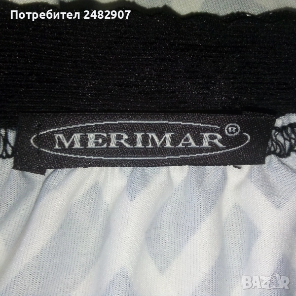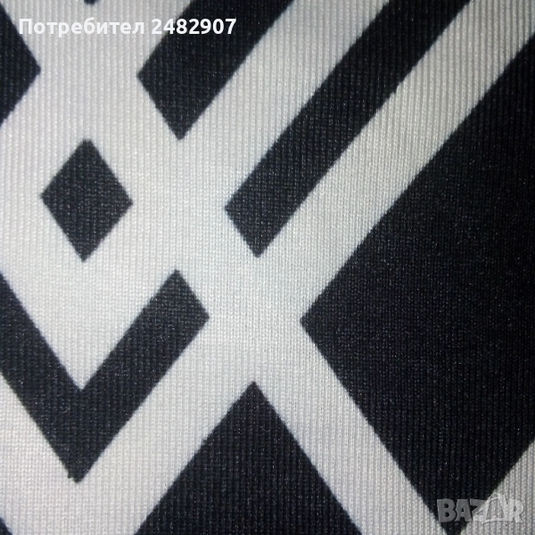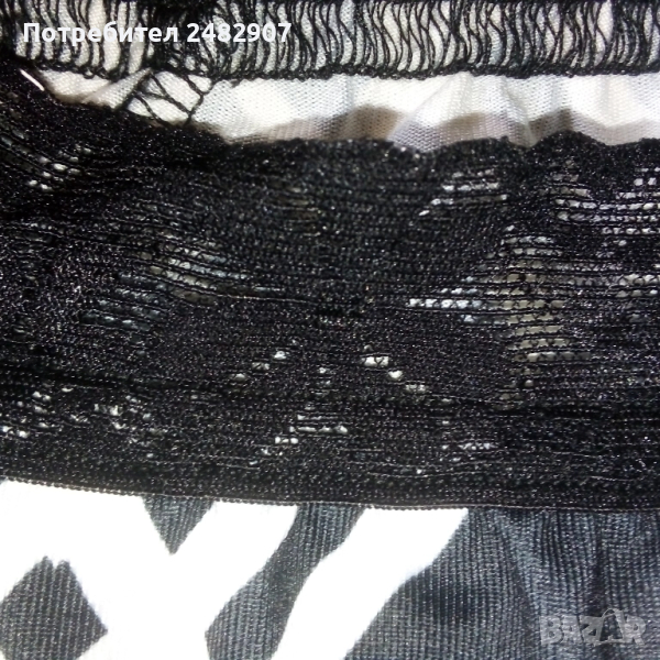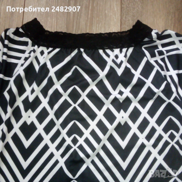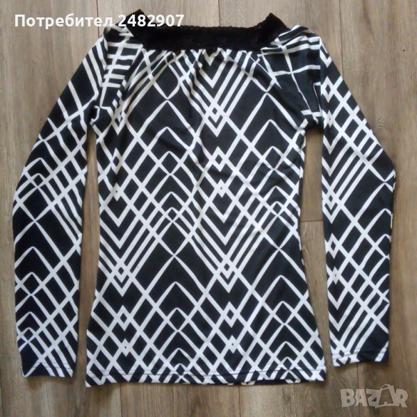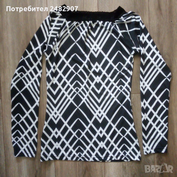 Ефектна дамска блуза в черно и бяло с дантела на деколтето, размер S. Съдържа 90 % микрополиамид и 10 % еластан. Ширина под мишниците - 38 см, ширина в долната част - 41 см, дължина от деколтето до долу - 60 см, дължина на ръкава от деколтето - 65 см, ширина на ръкава в долната част - 9 см. Чисто нова, не е използвана.