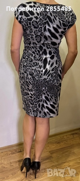 Елегантна рокля с животински принт в черно, бяло и сиво. Лека и удобна материя, с красиво деколте и къси ръкави. Подходяща за ежедневието или специални поводи.