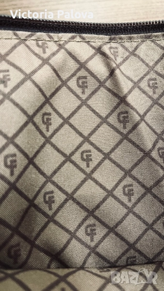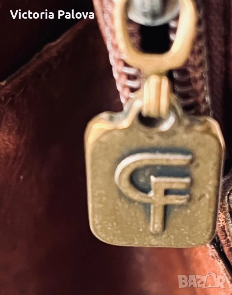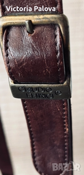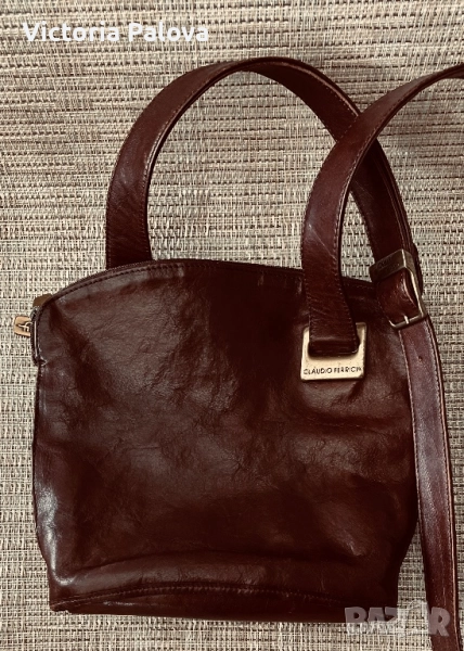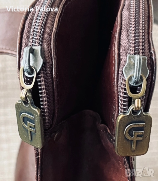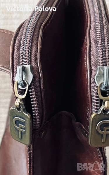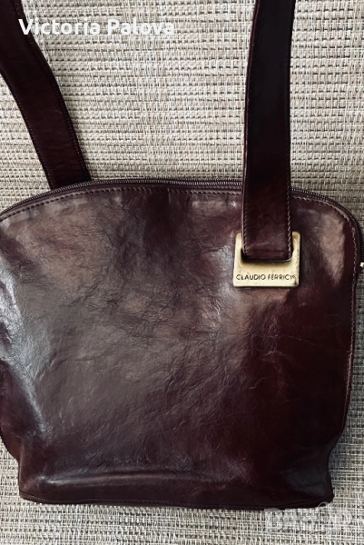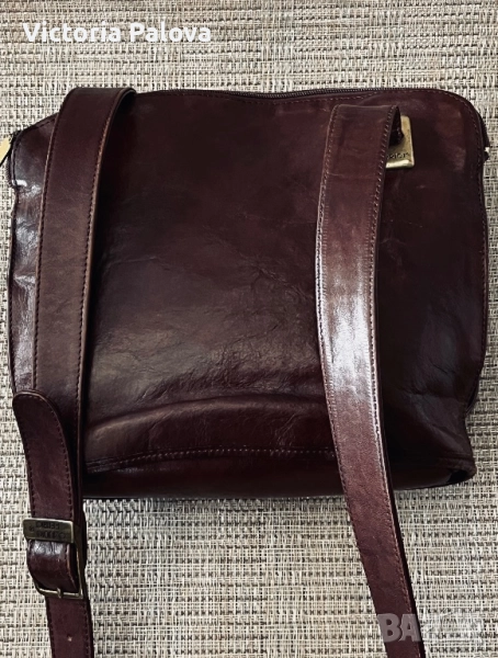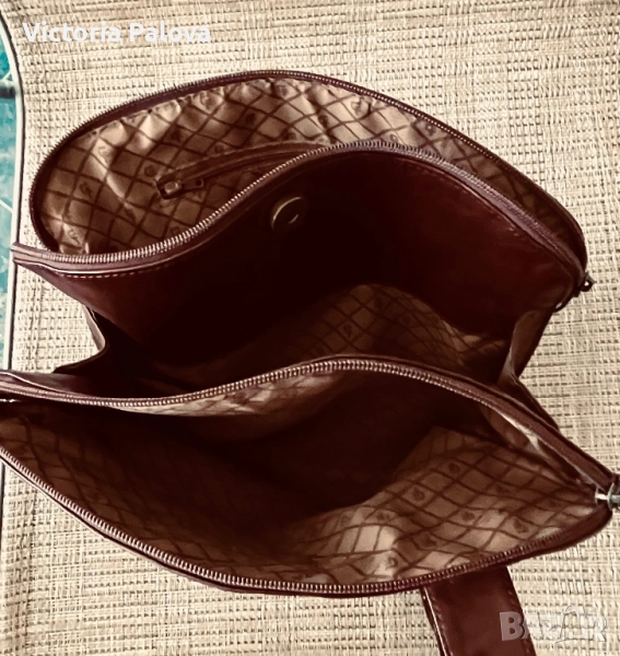 Много интересна чанта с една широка ( 3,4см) дръжка, поставена по особен начин, хубава кожа и цвят. Дъното : 26см на 13см, широчината на чантата - 27см, височина - 25см, регулируема дръжка - 125см. Отделението по средата е с магнитно копче, две други са с цип. Чантата няма забележки, рядка находка е, много удобна и красива.