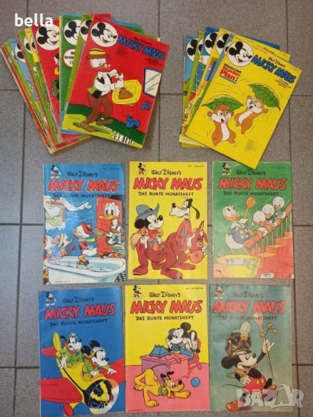 комикси Мики Маус общо са 116 броя ,годините са 1951-3 броя 1952 3 броя ,1965,73,74,75,76,77,78,79,1980 до 1998 година.Продава се цялата колекция ,цена 580 лв .Списанията са на немски език.Цена 464 лв (4 лв ви излиза брой)
