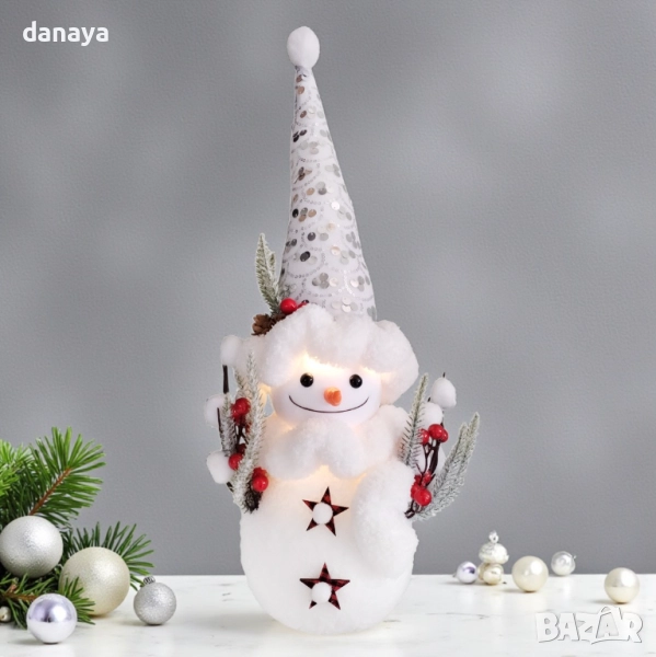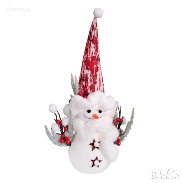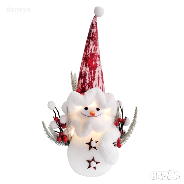 Внесете празничен уют и зимна коледна магия у дома с този очарователен светещ снежен човек с висока шапка – 56 см. Изработен от пухкав материал и украсен с детайли като червени плодчета, борови клонки и декоративни звезди, този коледен снежен човек е идеалното допълнение към вашата коледна украса.