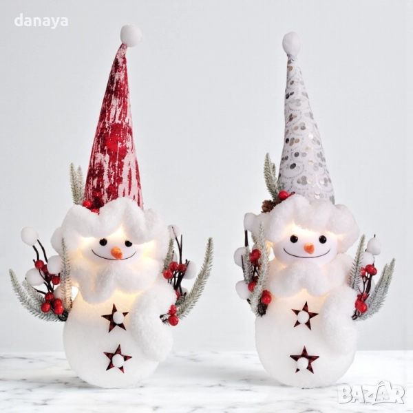 Тази декоративна светеща фигура снежен човек е налична в два прекрасни варианта – с червена или бяла шапка, което ви позволява лесно да я съчетаете с останалите коледни декорации. Независимо дали я поставите до елхата, върху камината или на празничната маса, тя ще се превърне в неустоим акцент.