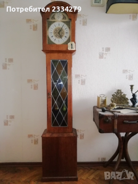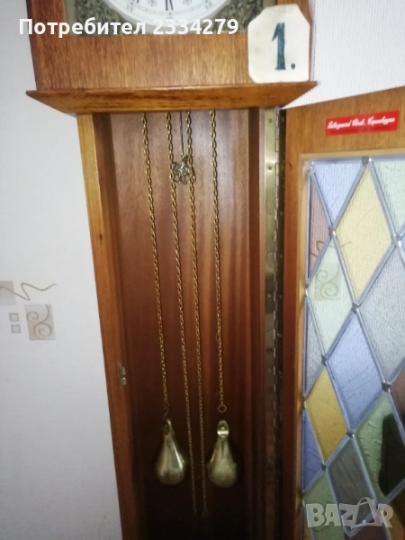 Стари стенни и паркетни часовници от различни години. N:1 стар паркетен часовник ,, Tempus Fugit", Tempus Fugit Grandfather, made in Germany Clock, Palle sgaard block, Kopenhagen, механичен със синджири и тупузи,махало и гонг на всеки половин и кръгъл час, дървена орнаментирана кутия с размери: височина 1м.75см.,широчина 37х25см., цветни стъкла поставени на оловна рамка, цена 250лв.; N:2 стар немски механичен