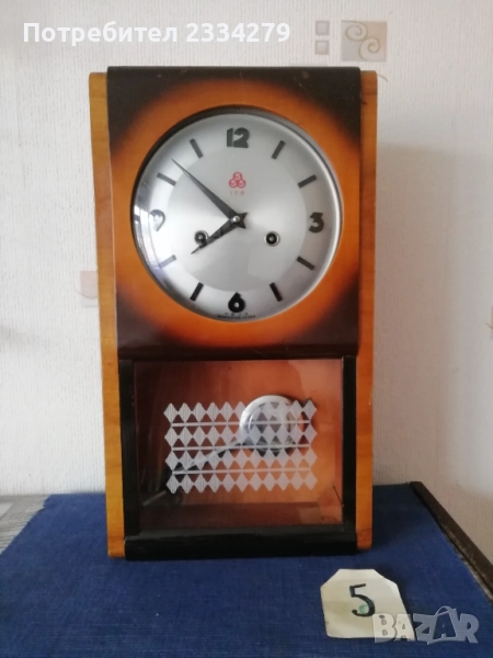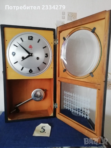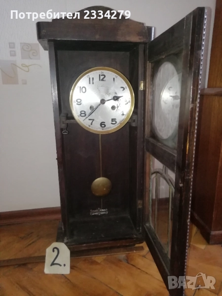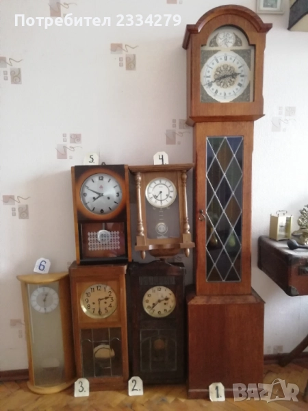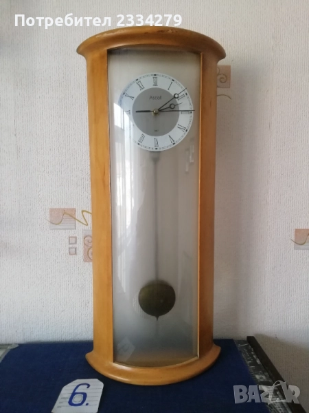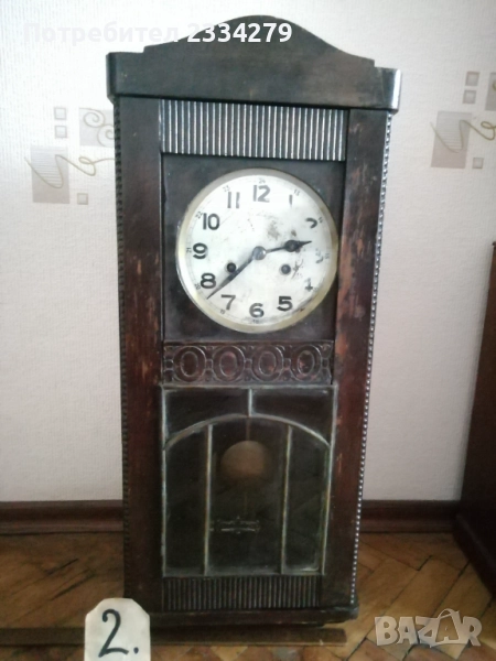 стенен часовник 30-40те години, дървена кутия с дърворезби, орнаментирани стъкла, размери 60х28см., цена лв.; N:3 стар немски ,,JUNGHANS" механичен с гонг, работещ, дърво и орнаментирани стъкла, махало и ключ оригинал, размери 63х27см., цена 130лв.; N:4 дървен орнаментиран стар часовник ,,Нerme" GERMANY, механичен с гонг в много добро състояние но (прожината за навиване не задържа, връща обратно, иначе е здрава), цена 60лв.; N:5 механичен часовник с мелодичен гонг произведен през 70-те години ,,555 SHANGHAI" работещ, дървена кутия, две стъкла, ключ, махало, размери:48х29см., цена 60лв.; N:6 немски много добре запазен електромеханичен ,, АSCOT" QUARZ, произведен 12. 2005год. има движещо се махало, дървена кутия, двойно стъкло, размери 57х27см., цена 50лв.