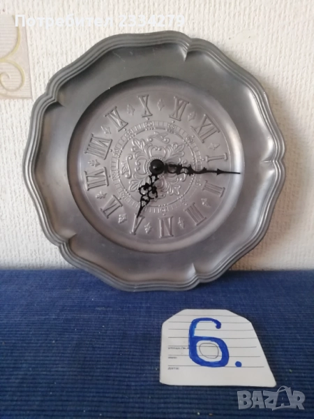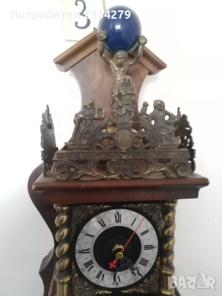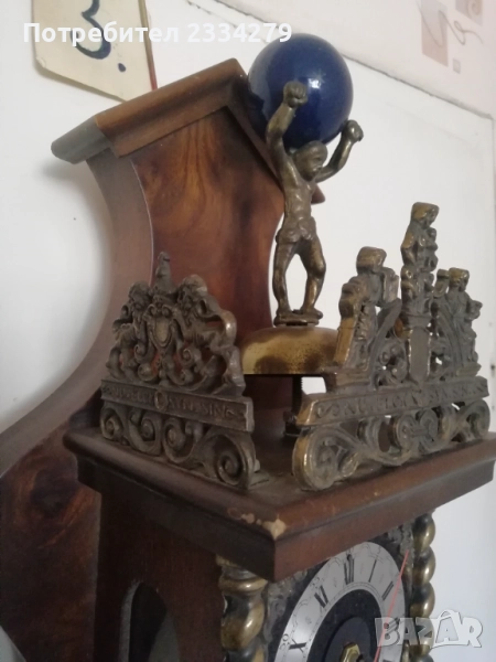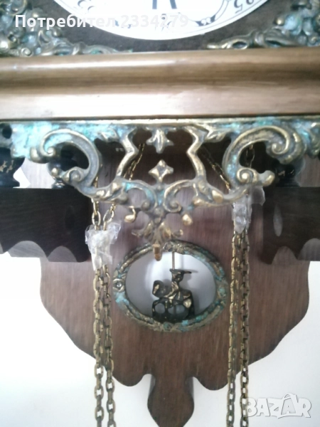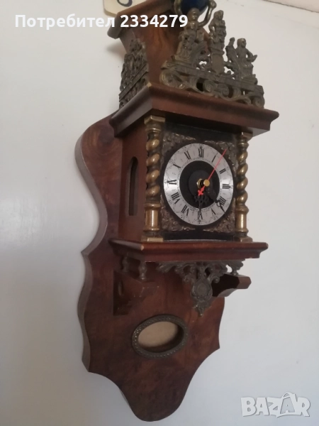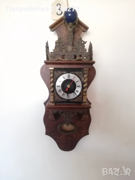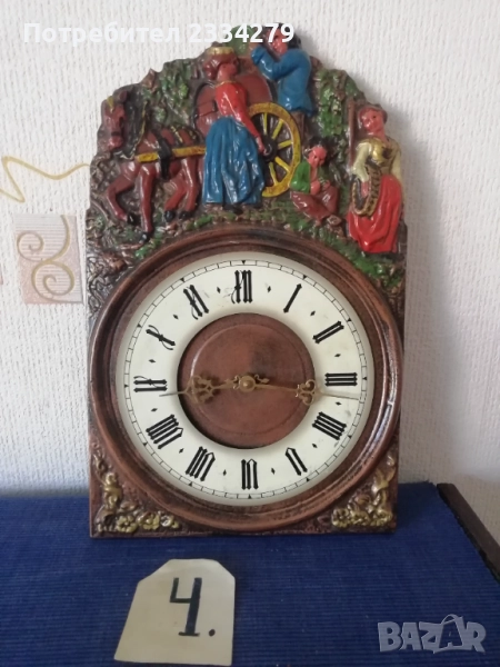 часовник с гонг в бароков стил, флоренциански орнаменти отляти от бронз и поставени на дървената кутия, орнаментирано махало с конник, тежки масивни бронзови тупузи и синджири,, размери 70х27см., цена 200лв.; N:3 стенен стар часовник стил барок, дървена кутия с масивни бронзови флоренциански орнаменти, електромеханичен, размери 55х21см., цена 70лв.; N:4 стар стенен немски часовник, ръчно отливан и рисуван изобразяващ селски Баварски мотив, размери 38х25см., цена 45лв.; N:5стар немски часовник, електромеханичен, дърво месинг, размери 30х30см., цена 30лв.; N:6 ,,KIENZLE"стар немски часовник, електромеханичен, изработка от 100%цян има щемпъл, раз мери 23х23см.,цена 25лв.