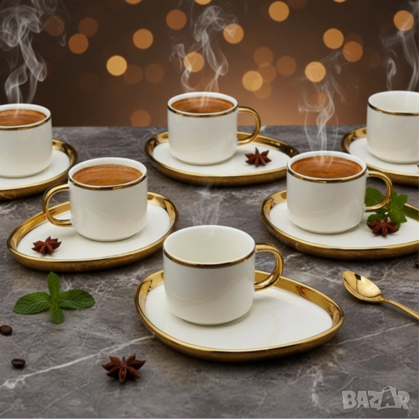 Комплект от 6 чашки с чинийки; Материал: висококачествен порцелан; Кант: златен или сребърен; Вместимост: приблизително 80–90 мл; Подходящи за горещи напитки; Предлагат се в шест красиви варианта: Evil Eye – защита, лукс, символика Silver Heart – минимализъм, елегантност, хладна прецизност Golden Heart – топлина, хармония, златен акцент Hexa Gold – модерна геометрия, смел стил Peacock Dream – артистичност, блясък, изтънченост Royal Feather – кралски чар, фин детайл, нежност