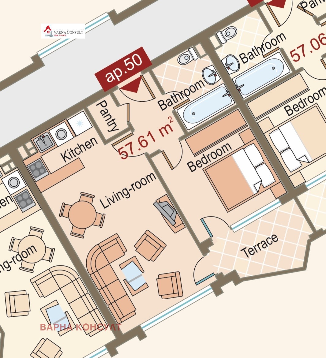 Освен този имот, Варна Консулт предлага и разнообразие от други апартаменти в комплекса двустайни, тристайни и мезонети, обзаведени или завършени до ключ, които съчетават модерно изпълнение, комфорт и уникална близост до морето.