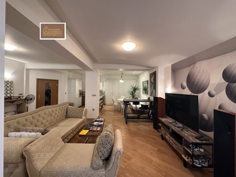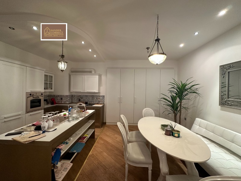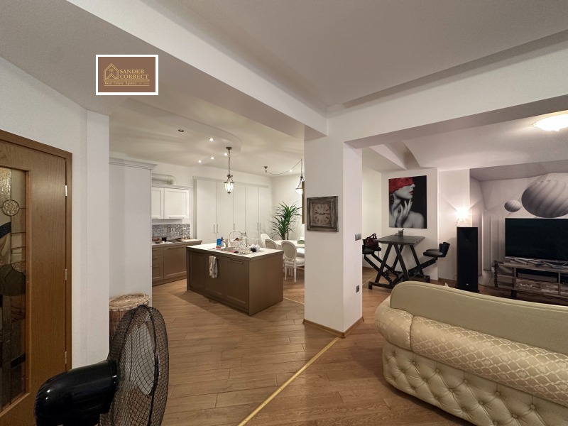 Представяме Ви за продажба многостаен апартамент, подходящ за офис, със ЗП по нот. акт (без терасата) от 149 кв.,а по експертно заснемане ЗП 155кв.м. и тераса от 77кв.м.,който е в малка поддържана сграда, само с четири апартамента и с отличен вход. Сградата е построена през 1936г., стабилна железобетонна конструкция с търговски обект на партера. Районът е тих и спокоен, улицата е бутикова и е на минути от пешеходната част на бул.Витоша. Апартаментът е аристократичен и представителен, ремонтиран преди няколко години с висок клас довършителни работи и материали. Трофеен имот на престижен адрес в топ центъра на столицата. Жилището по нот. акт се състои от вестибюл, четири стаи, антре, кухня, баня, тоалетна, килер и огромна тераса, но разпределението му е променено както следва: широко входно антре с врати към голяма южна спалня с просторна баня и санитарен възел,втора врата към хол, трапезария, с голяма кухня (поръчкови шкафове и вградени електоуреди и барплот),цялото помещение от 75кв.м., като холът и спалнята са с френски прозорци и излаз на южната тераса. Оше от входното антре има врата към тоалетна за гости с душ, и друга врата, през която се стига до коридор, следва голяма втора кухня с трапезария и усвоен балкон, и преход към друга просторна спалня. С изложение югоизток(повече юг) е дневната и първата спалня(двете с излаз на терасата от 77кв.м.), и на северозапад са втората кухня и другата спалня.Към имота има прилежащи мазе от 7,5кв.м., таван от 30кв.м., и ид. части от дворното място. Имотът е подходящ за адвокатска, нотариална кантора, инвестиция. За въпроси, допълнителни снимки,уточнения и огледи: 0888959939- Александрова