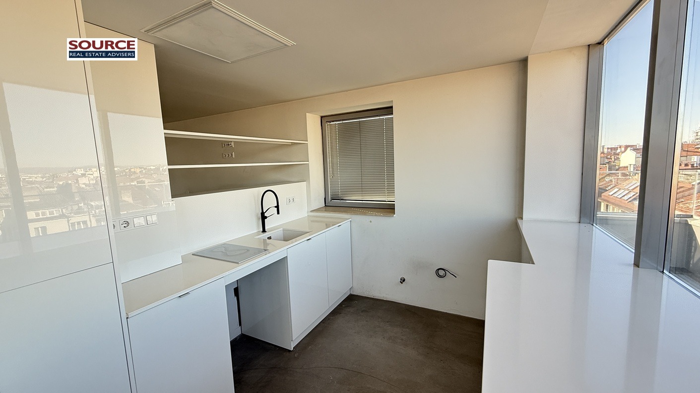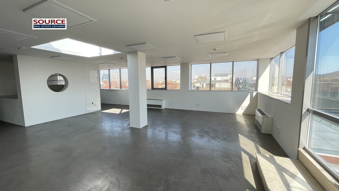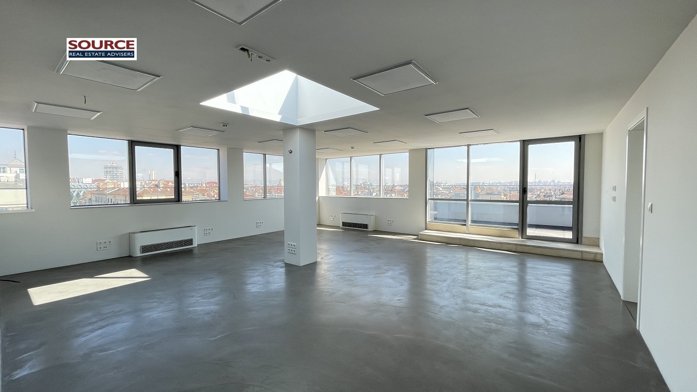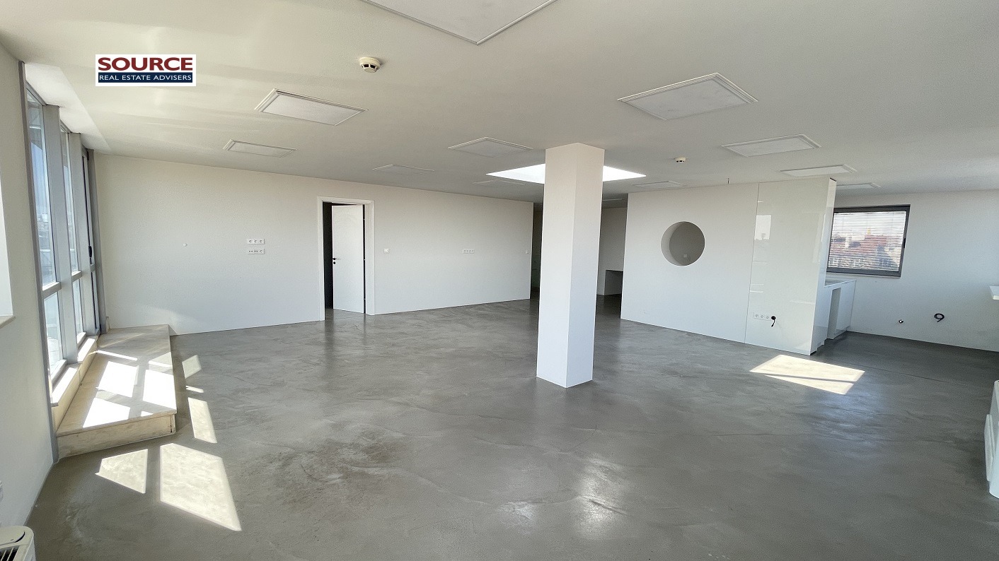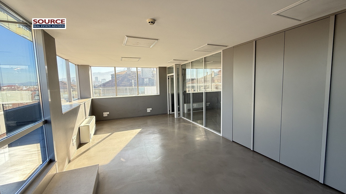 2. Разпределение: 2 голeми и светли Open space помещения /двете могат да бъдат обединени в едно голямо Open space помещение/, 2 отделни работни помещения преградени с гипсокартонени и стъклени преградни стени, оборудвана кухня, рецепция, сървърно помещение, 2 wc с баня, панорамна тераса /80кв.м., включена в указаната площ/. Офисът може да бъде изцяло с Open space разпределение или допълнително преграден.