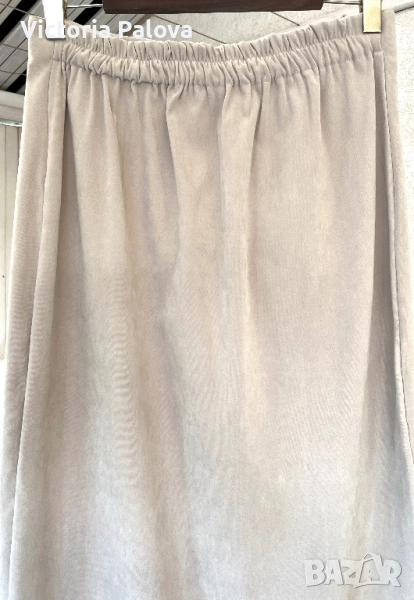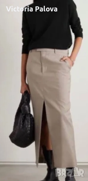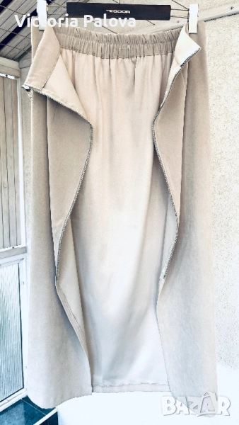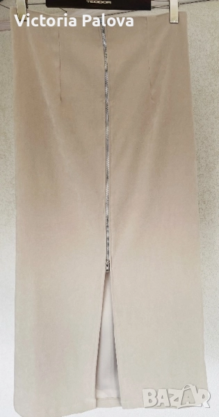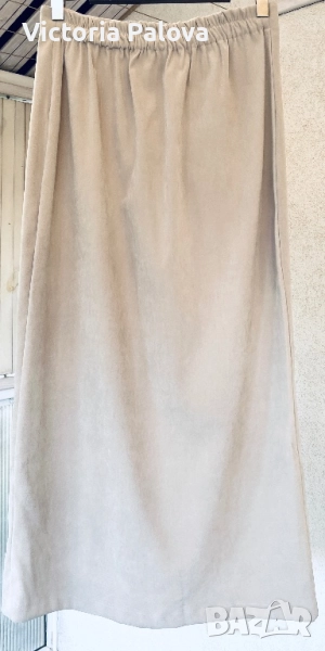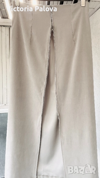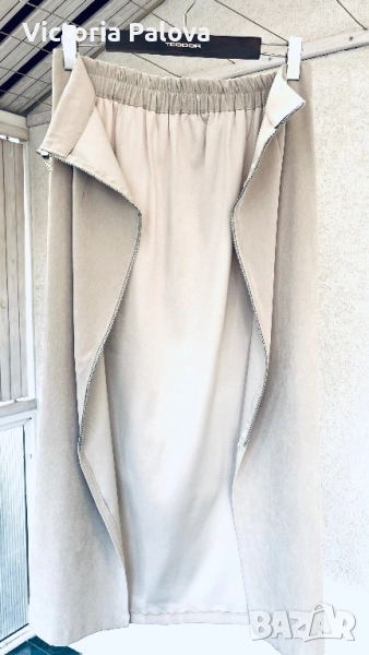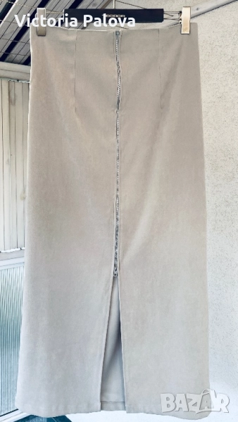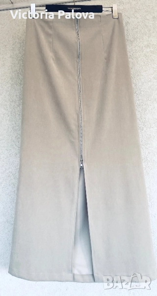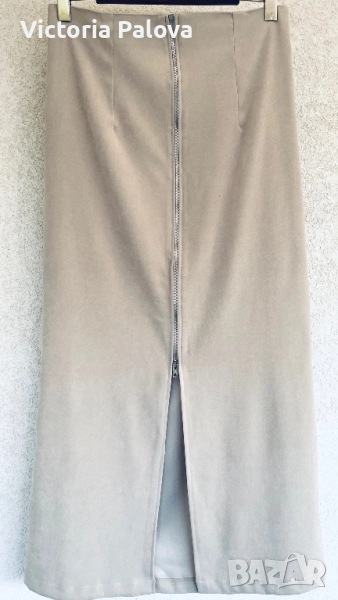 Дълга пола с цип през цялата дължина, откопчава се нацяло. За есенния сезон е, комбинира елегантност и комфорт, подчертавайки силуета. Перфектна за офис, срещи и градски разходки, съчетава се с риза , тишърт или сако. Талия - 42см , разтяга се до повече поради ластика в колана, ханш - 55см, дължина - 96см. Материята е мека, има разтегливост.