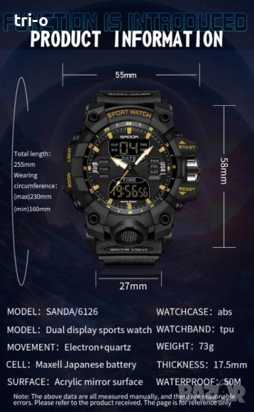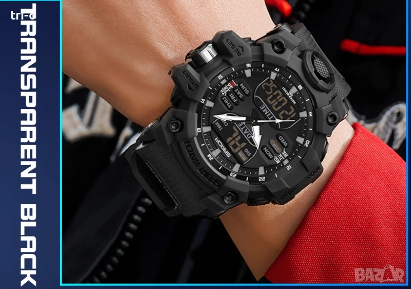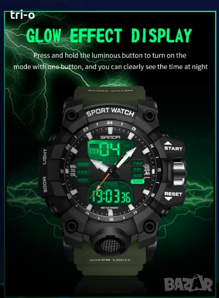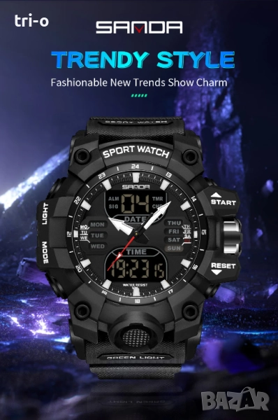SANDA Луксозен мъжки електронен часовник, спортен, LED, аналогов, дигитален, хронограф, военен, двоен дисплей, 50M водоустойчив.