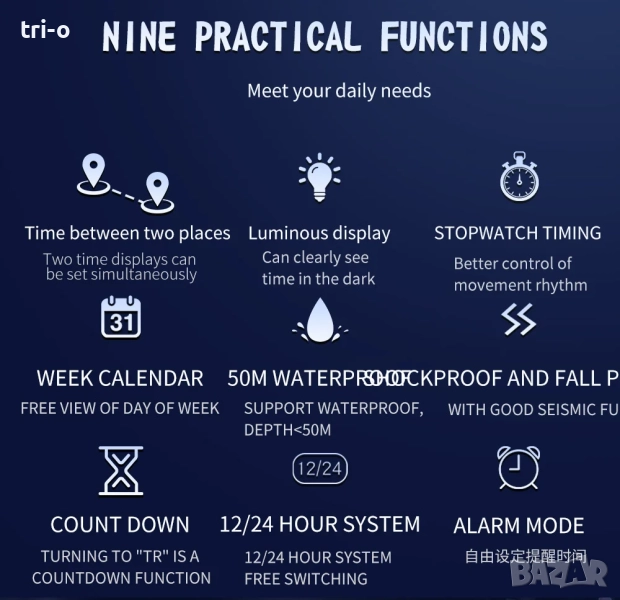 Функция: Удароустойчив, LED дисплей, хронограф, аларма, седмичен дисплей