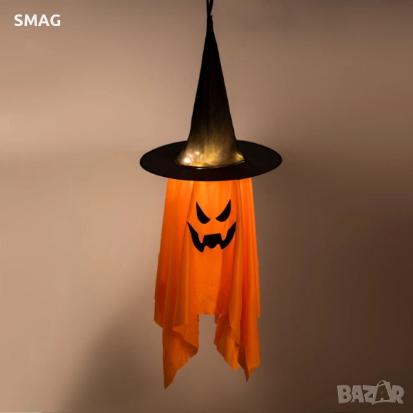 Висяща Хелоуин / Halloween декорация – призрак с тиква в оранжево, с висока черна шапка на вещица и LED с топло бяло осветление. Работи с 3 батерии AG13 (включени в комплекта).