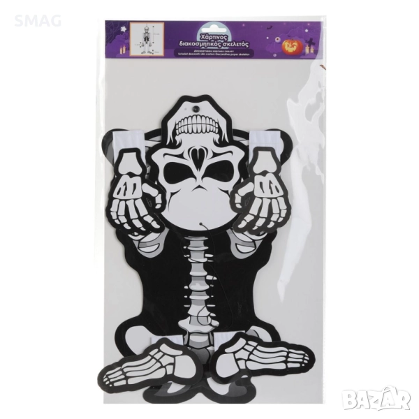 Създайте страховита Halloween / Хелоуин атмосфера с този декоративен хартиен скелет! С подвижни ръце и крака, които се движат, той добавя динамичен и забавен ефект към вашата украса. Идеален за дома, офиса или парти пространство, този скелет придава реалистичен и впечатляващ акцент на вашата Halloween / Хелоуин декорация.