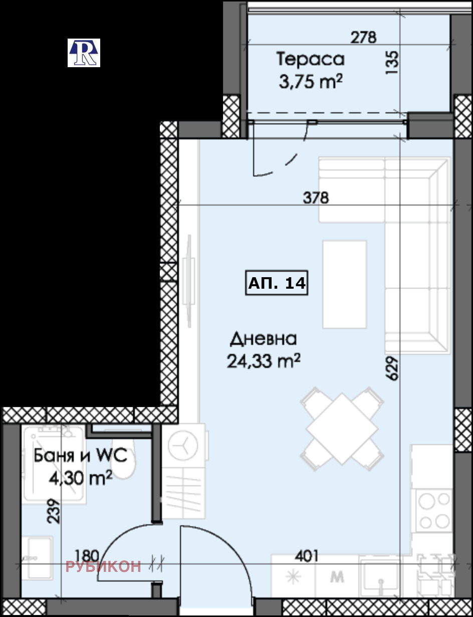 Разпределението на апартамента е както следва: просторна дневна(24.33кв.м), баня с тоалетна(4.30кв.м) и тераса(3.75кв.м). Застроена площ(37.53кв.м.). Общи части (8кв.м.). Общо площ (45.53кв.м.). Изложение - Запад!