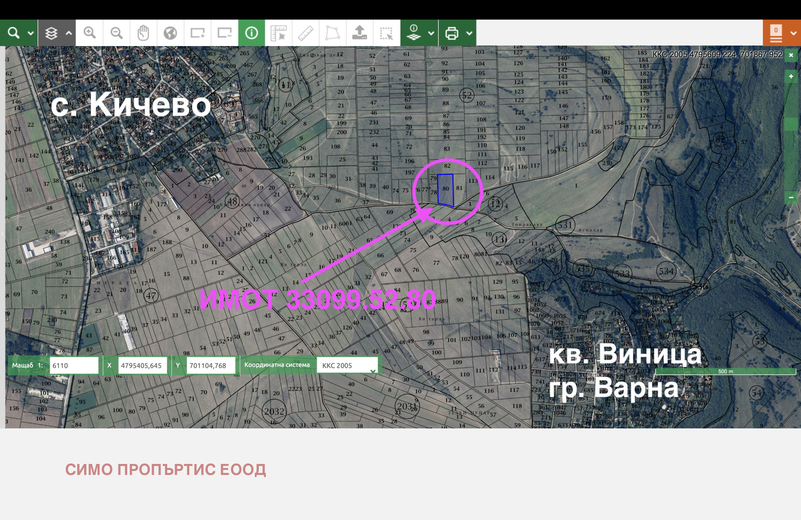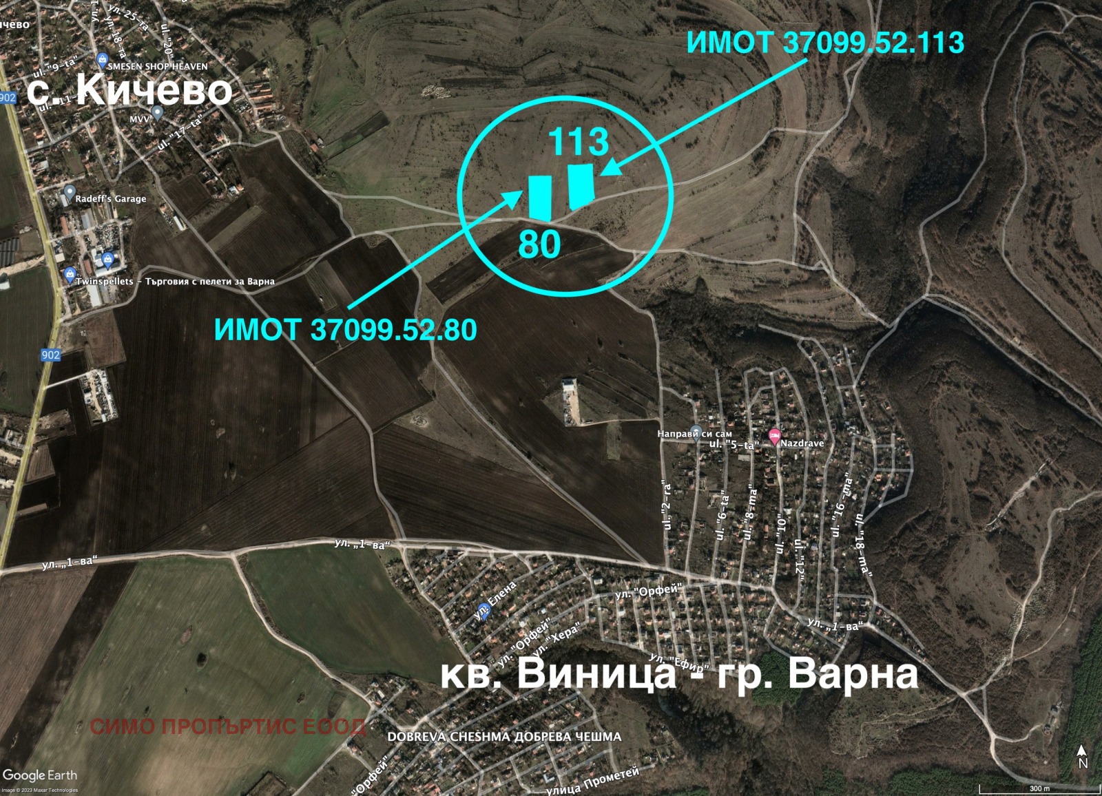 Продават се два имота с много добра гледка към морето с обща площ 11000 кв.м.. Имотите административно се намира в землището на с. Кичево, над м-т 'Добрева чешма' - кв. Виница -гр. Варна. Имотите са предназначен за жилищно строителство. Имат изтекъл ПУП! Попадат в градоустройствена зона 'Жм' с показатели на застрояване: