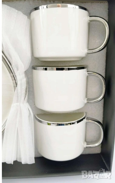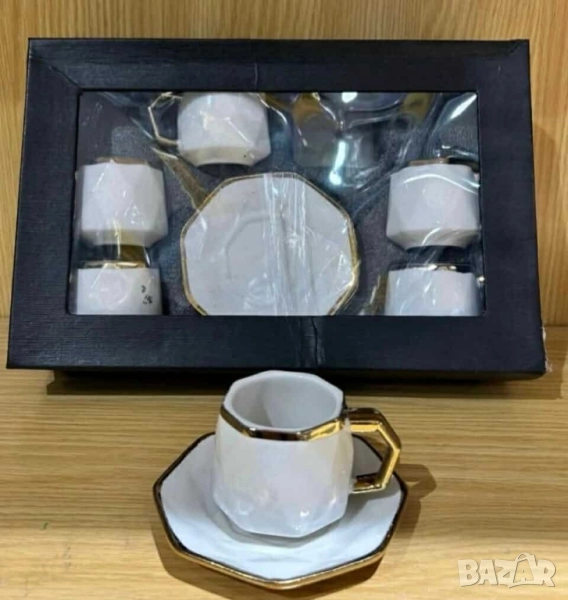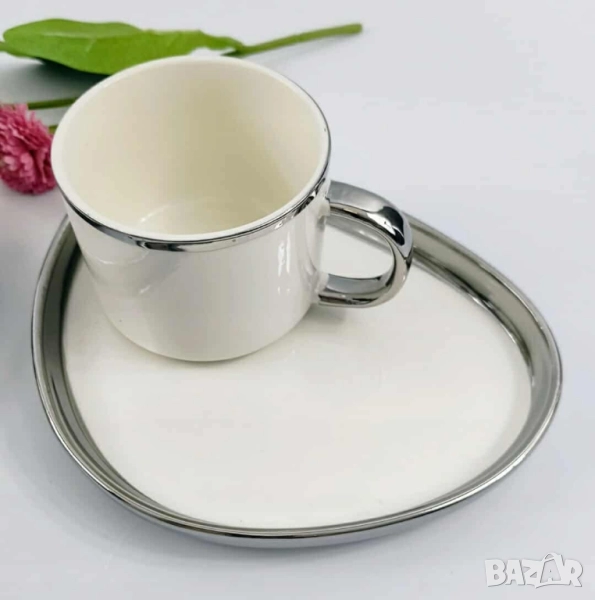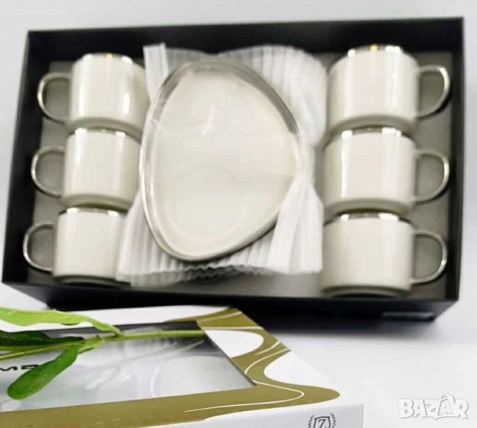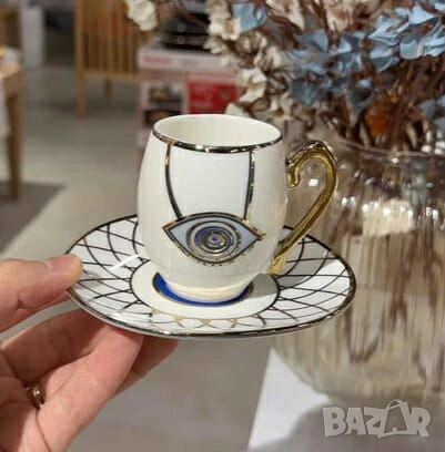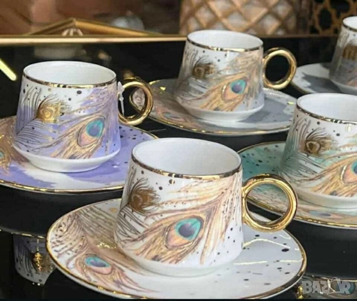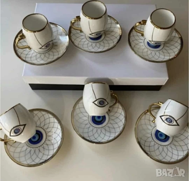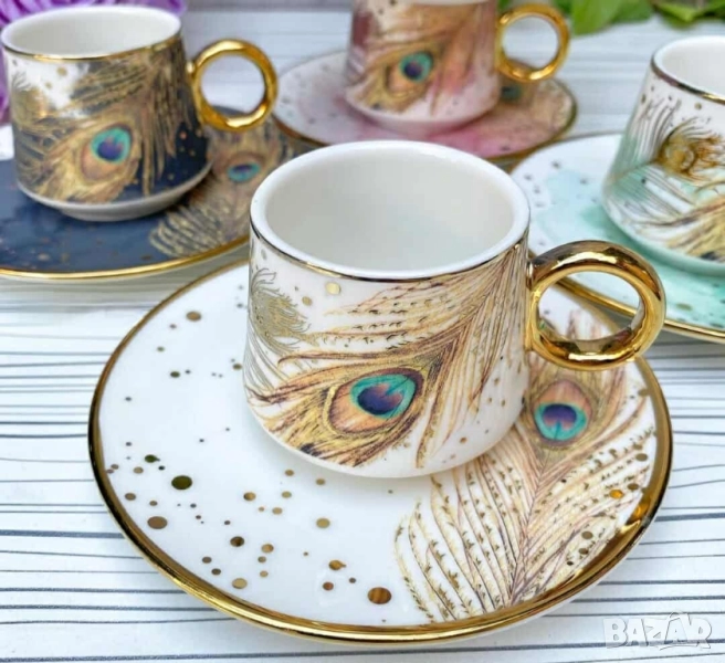 Комплект от 6 чашки с чинийки; Материал: висококачествен порцелан; Кант: златен или сребърен; Вместимост: приблизително 80–90 мл; Подходящи за горещи напитки; Предлагат се в шест красиви варианта: Evil Eye – защита, лукс, символика Silver Heart – минимализъм, елегантност, хладна прецизност Golden Heart – топлина, хармония, златен акцент Hexa Gold – модерна геометрия, смел стил Peacock Dream – артистичност, блясък, изтънченост Royal Feather – кралски чар, фин детайл, нежност