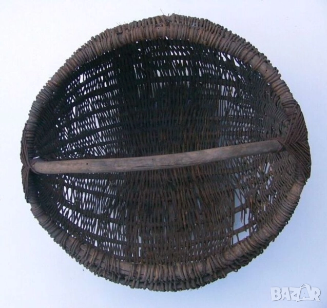 Традиционна селска дървена кошница тип ратан от началото на XX век, класическа ръчна изработка оплетка от местна дървесна лиана върху рамка скелет с ръкохватка за носене от ракита (върба).