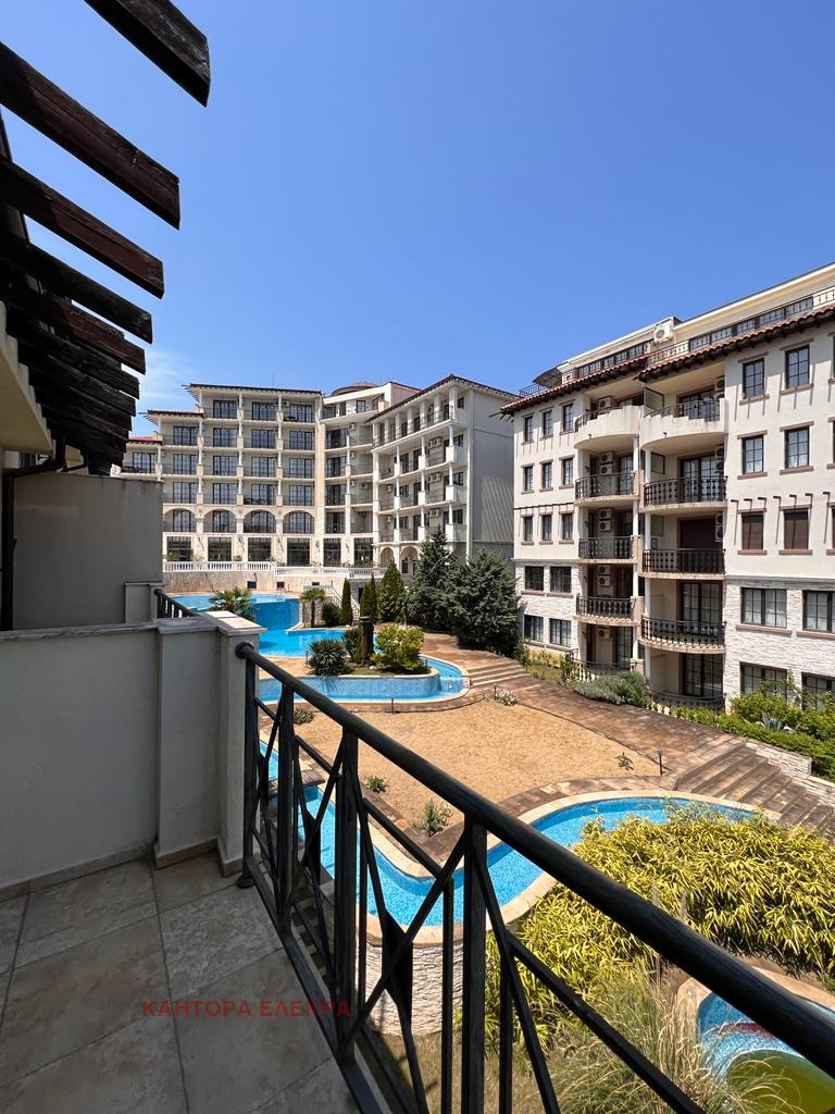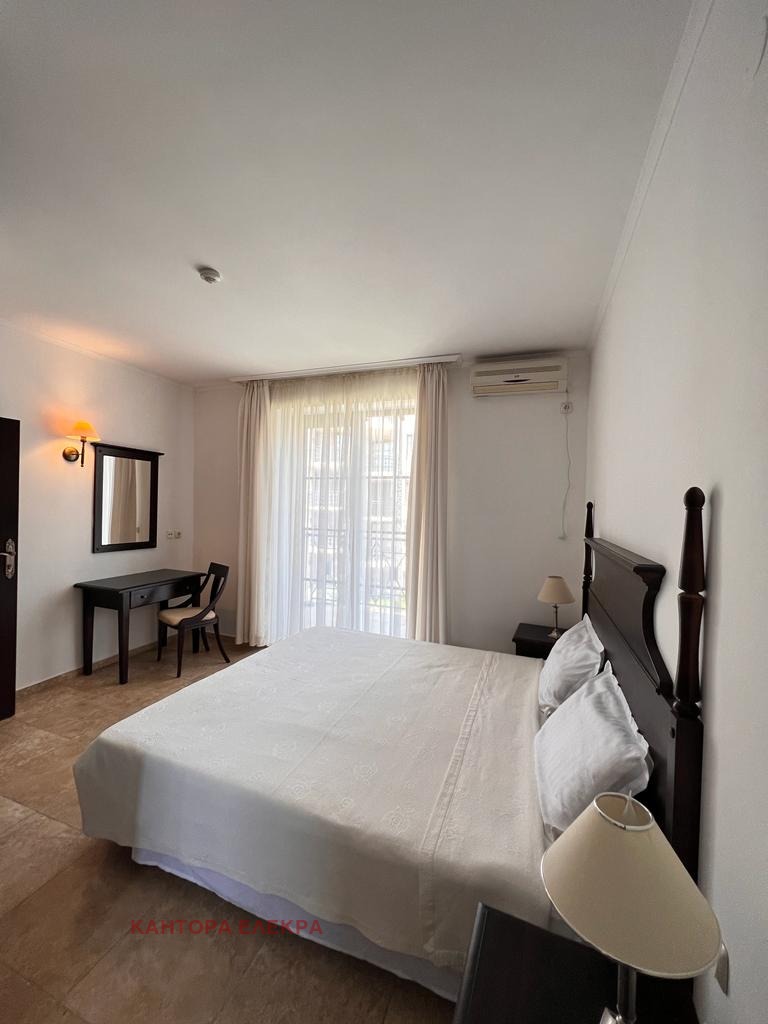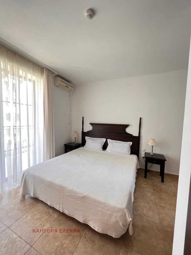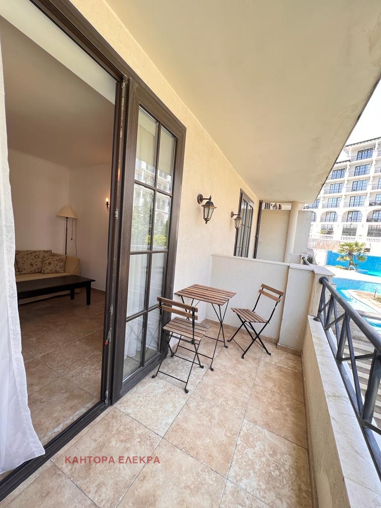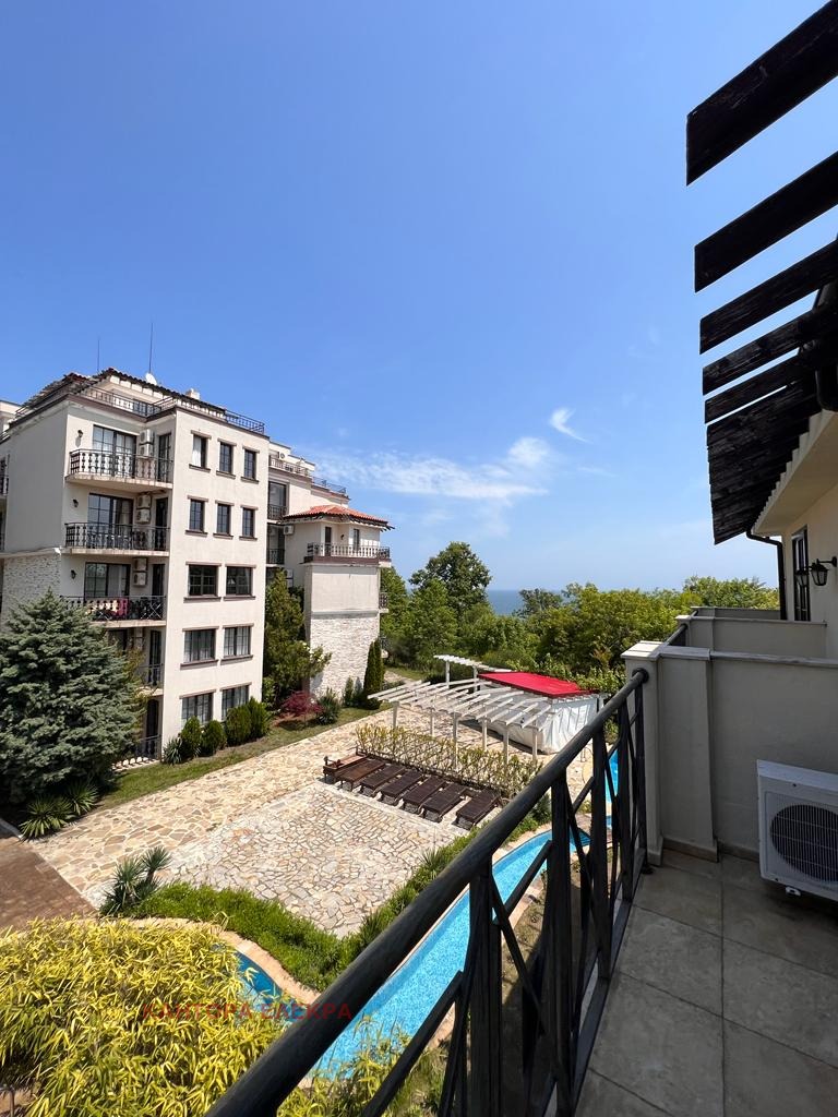 Апартаментът е просторен и много функционален, със следното разпределение голямо входно антре, всекидневна с кът за хранене и кухненски бокс, спалня, баня с тоалетна и вана, тераса с красива гледка към морето, озеленения двор и към басейна. Продава се в отлично състояние, добре оборудван и мебелиран, готов за нанасяне.