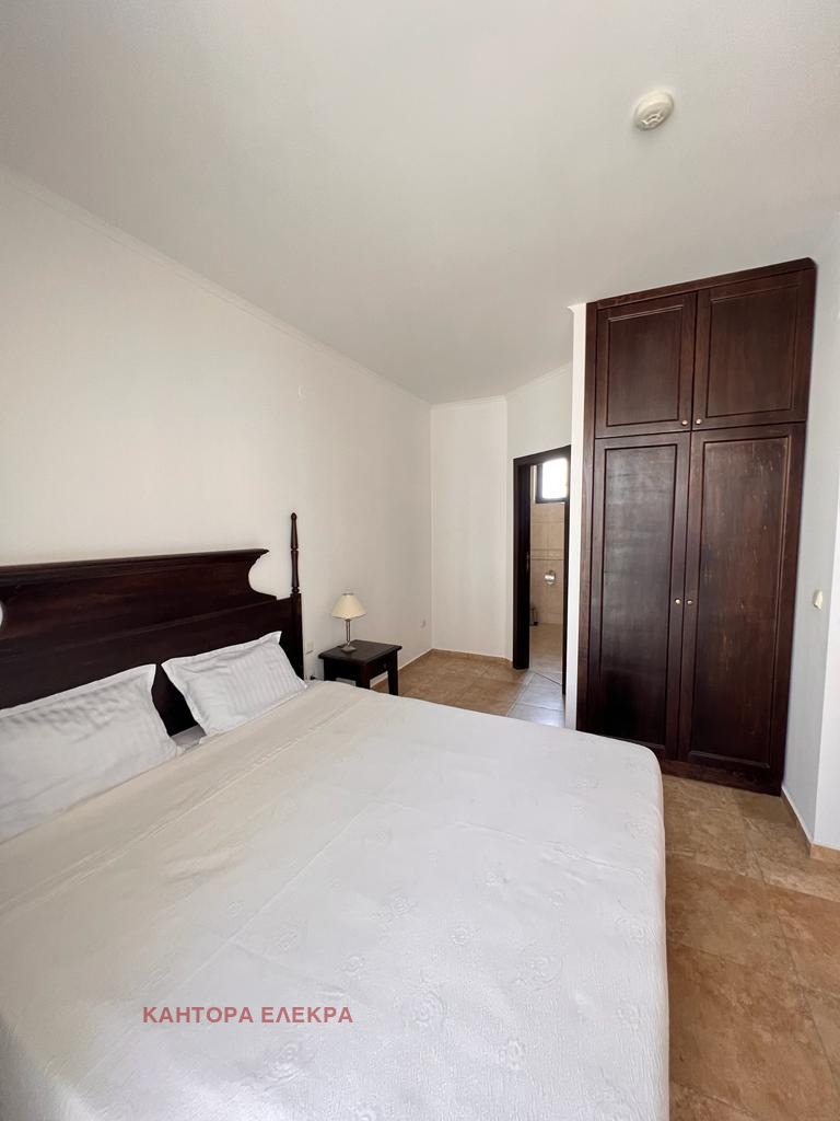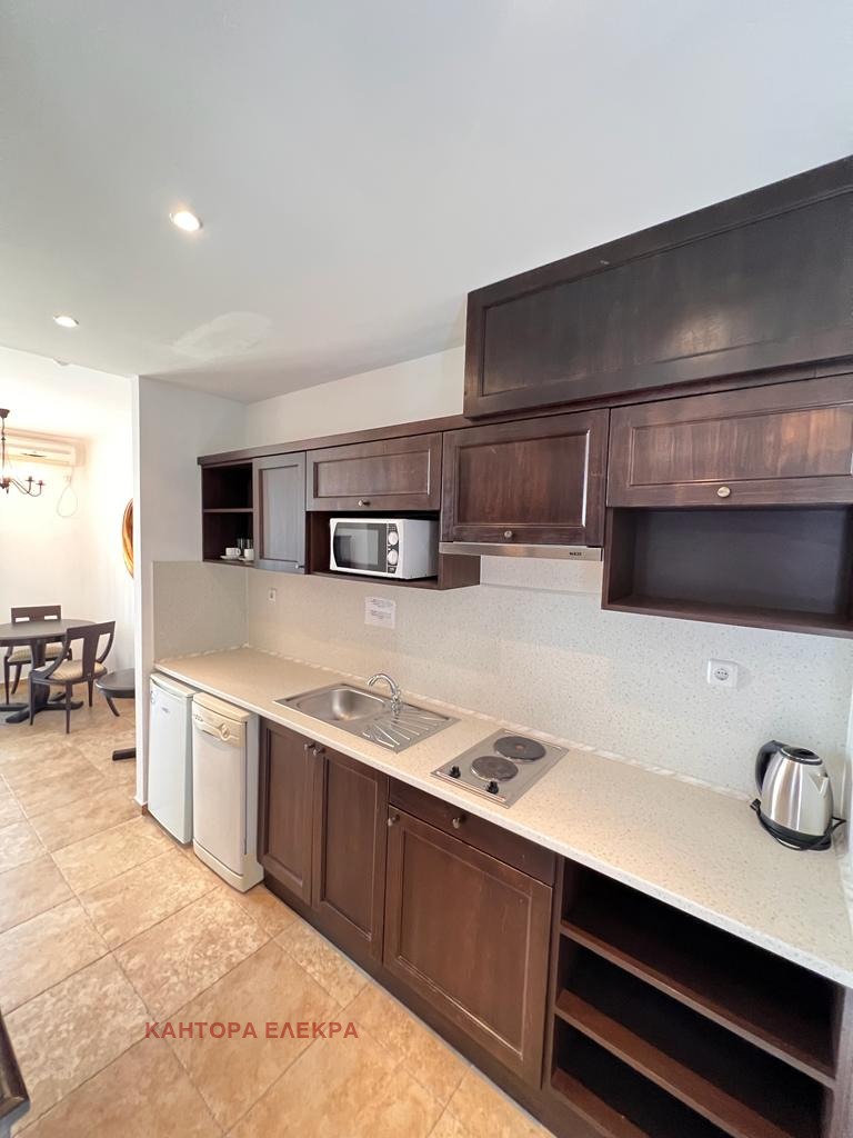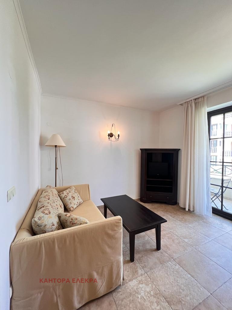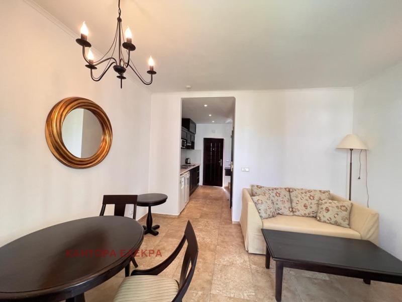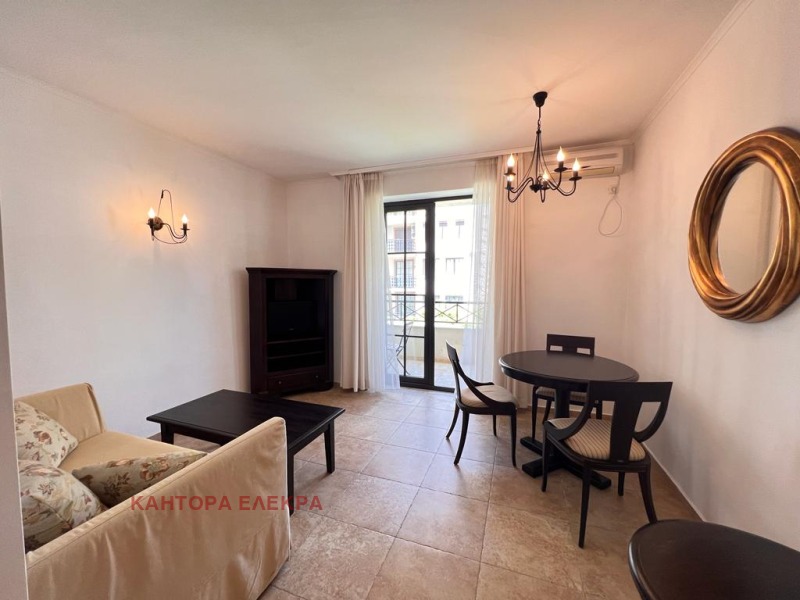 Апартаментът е просторен и много функционален, със следното разпределение голямо входно антре, всекидневна с кът за хранене и кухненски бокс, спалня, баня с тоалетна и вана, тераса с красива гледка към морето, озеленения двор и към басейна. Продава се в отлично състояние, добре оборудван и мебелиран, готов за нанасяне.