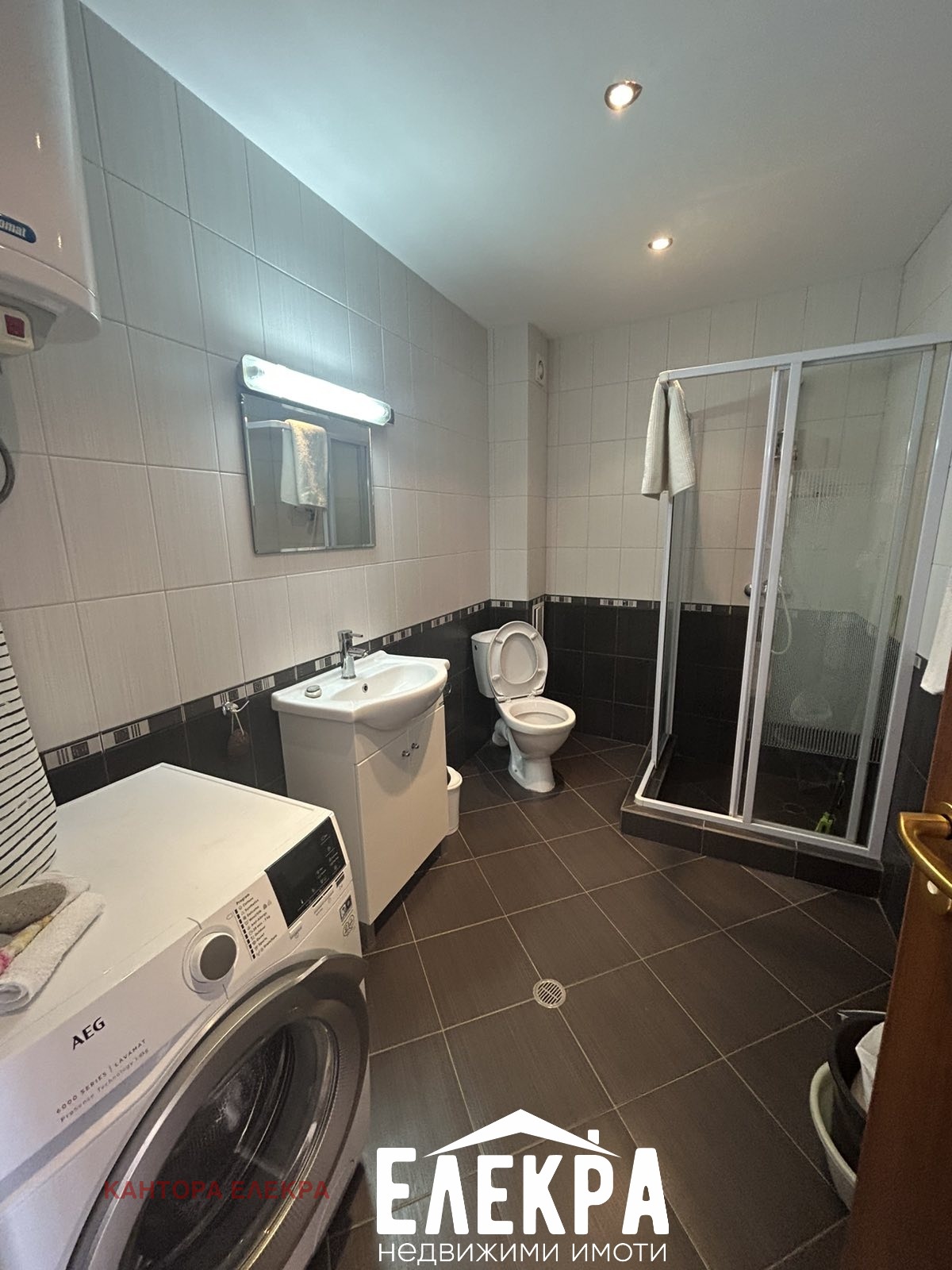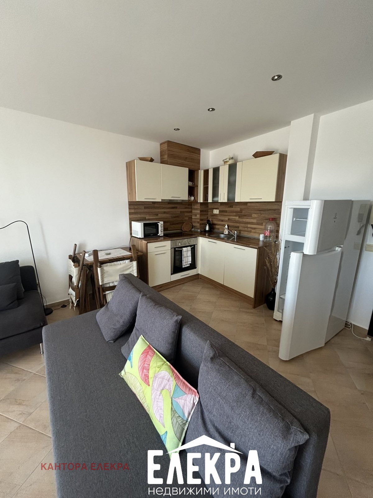 Апартаментът е напълно обзаведен и разполага с теракот на всички подове и теракот на стените в банята, климатик (отопление и охлаждане), както и кухненско обзавеждане, електроуреди (фурна, плот, микровълнова, съдомиялна, хладилник).
