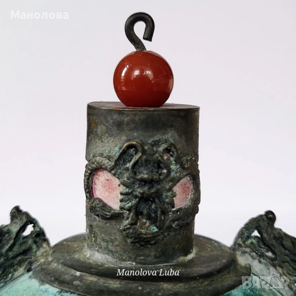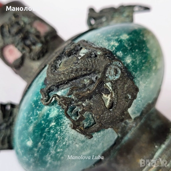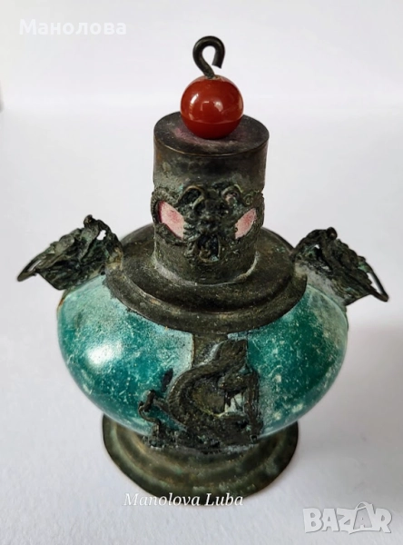 Бутилка изработена от тюркоаз. Камъка използван в тибетската култура символизира духовния баланс и небето. Запушалка лъжичка с дръжка е карнеол - това е камък на земята, символ на силата и красотата на нашата планета. Основен декор дракон символ на власт, сила, късмет и добродетел, като олицетворява небесна сила, мъжка енергия.