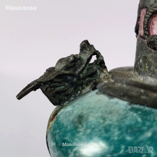 Бутилката представлява рядко творение, защото съчетава традиционна богата украса и каменен дизайн. Датирана края на 19ти век.