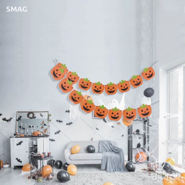 Добавете уютен и стилен щрих към Halloween / Хелоуин украсата си с този декоративен гирлянд от филц с тикви. С дължина 3.5 метра, той е подходящ за окачване на стени, врати, прозорци или камини. Изработен от мек филц в оранжев и черен цвят, гирляндът създава топла и празнична атмосфера, подходяща за всяко парти или домашна декорация.