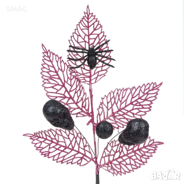 Добавете мистична и зловеща нотка към Halloween / Хелоуин украсата с това декоративно клонче, украсено с лилави листа, черен паяк и мини черепи. Идеално за поставяне във ваза, включване във венец или съчетаване с други елементи за впечатляваща тематична аранжировка.