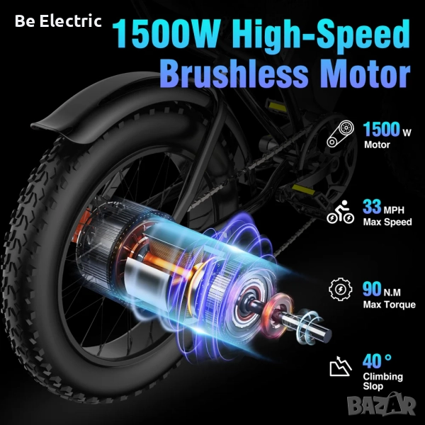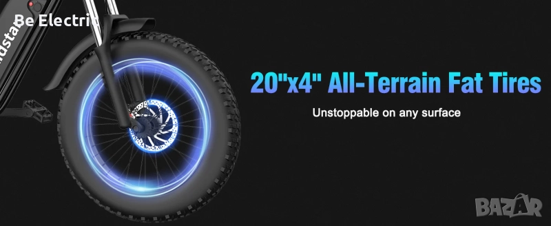 Моделът е идеален както за градско придвижване, така и за неравни терени, благодарение на стабилната алуминиева рамка и широките гуми 20x4”.