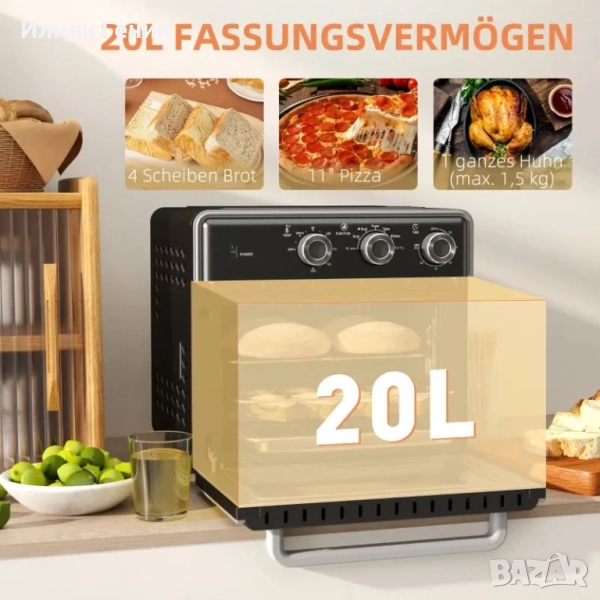 ✔ Големият капацитет от 20 литра ви позволява да приготвите едновременно 4 филийки хляб, цяло пиле (1,5 кг) или пица с диаметър 28 см