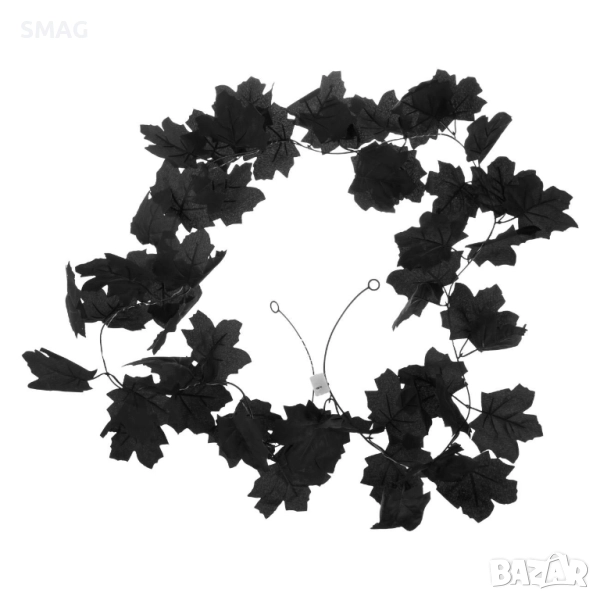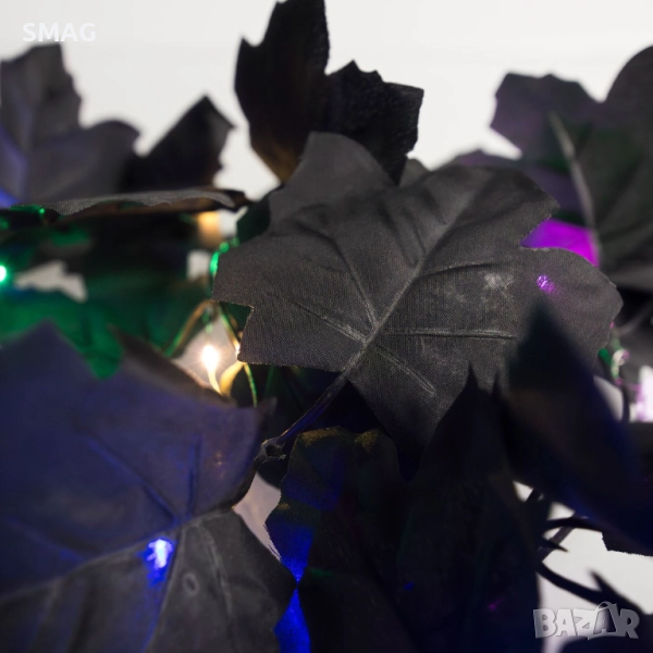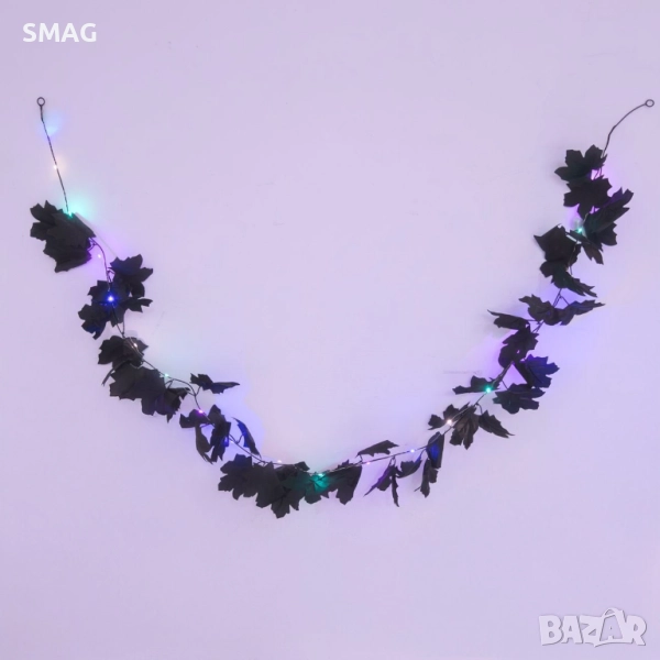 Декоративен Halloween / Хелоуин гирлянд с черни листа и вплетени LED лампички с лилава, синя и зелена светлина. Има три режима на осветление – мигаща, бавно мигаща и постоянна. Идеален за украса на стени, прозорци, витрини или маси, създавайки празнична и мистична атмосфера.