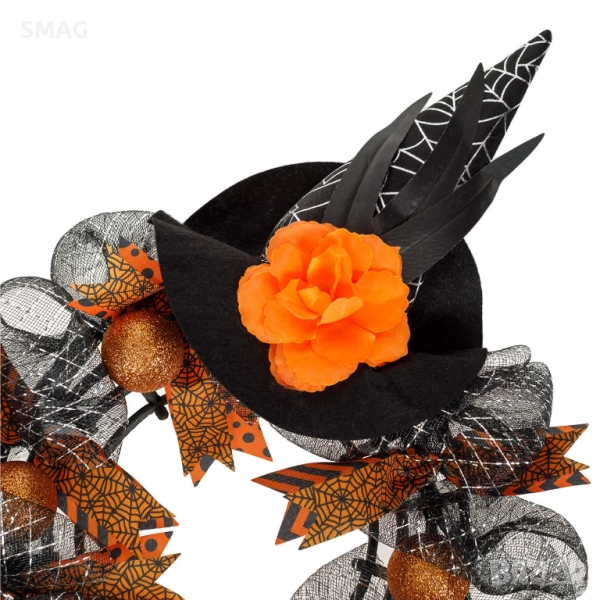 Декоративен Halloween / Хелоуин висящ венец, подходящ за врати, прозорци или стени. Създава празнична и мистична атмосфера и е идеален за тематични партита и украса на дома.