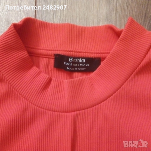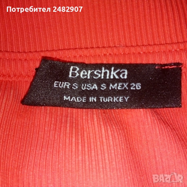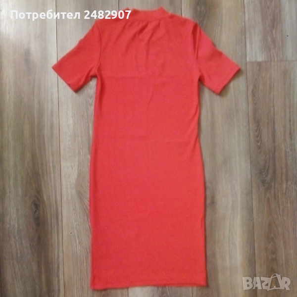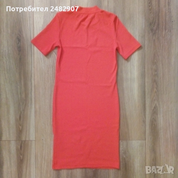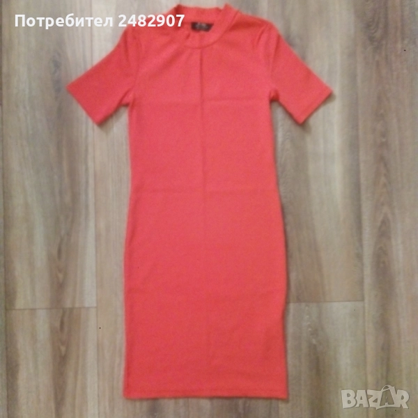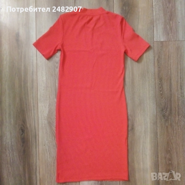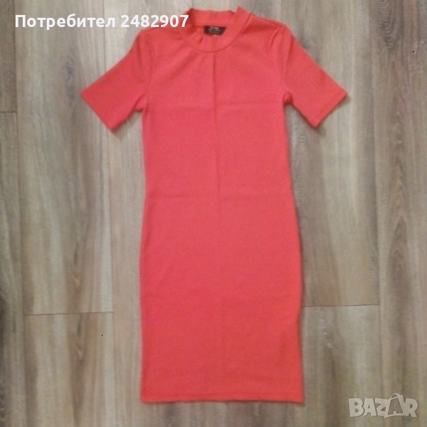 Дамска рокля "Bershka", размер S, неонов цвят. Съдържа 92 % полиамид и 8 % еластан. Ширина в раменете - 32 см, ширина под мишниците - 36 см, ширина в долната част - 36 см, дължина от рамото до долу - 83 см, дължина на ръкава от рамото - 20 см, ширина на ръкава в долната част - 12 см. Много запазена, обличана е само веднъж, без забележки, неразличима от нова.