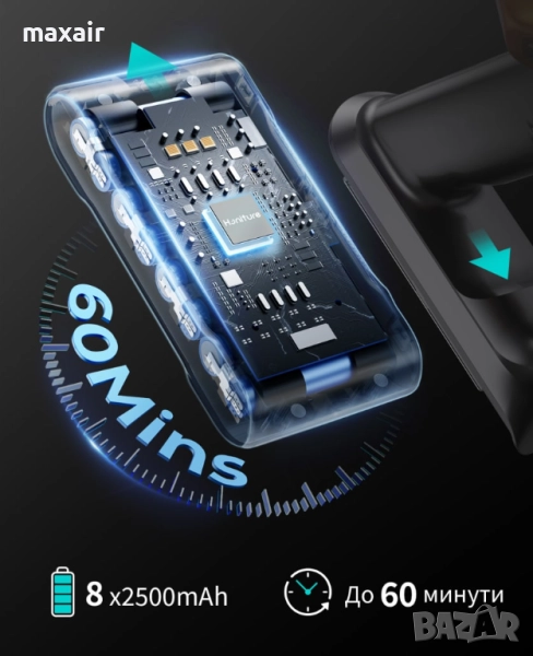 Прахосмукачката разполага с висококачествена сменяема батерия с капацитет 8×2500 mAh, осигуряваща до 60 минути работа в ECO режим за цялостно почистване с едно зареждане.
