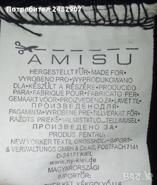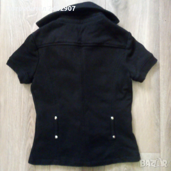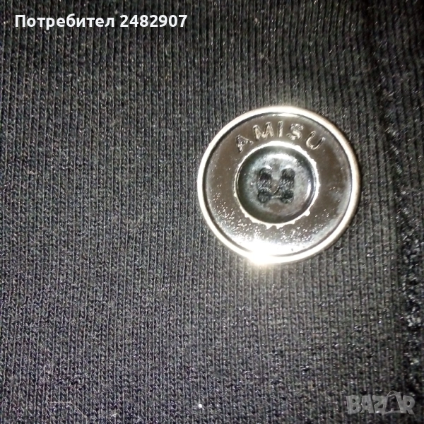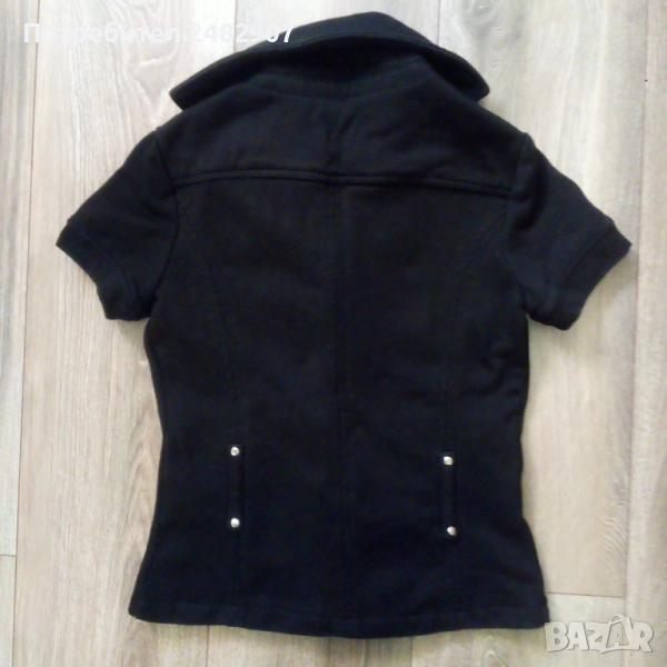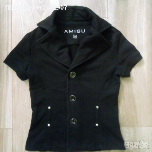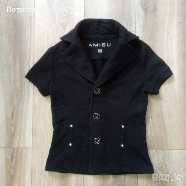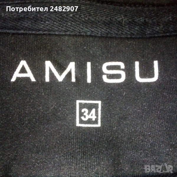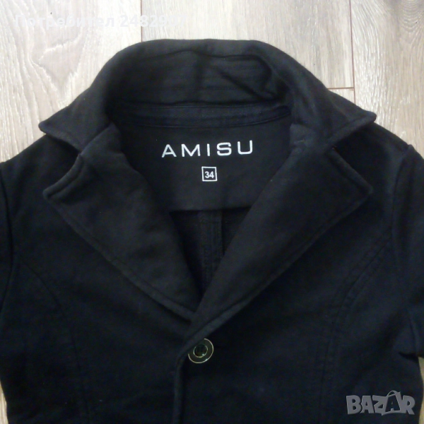 Памучно черно дамско сако Amisu", размер 34. Съдържа 90 % памук и 10 % полиестер. Ширина в раменете - 36 см, ширина под мишниците - 40 см, ширина в долната част - 40 см, дължина от рамото до долу - 51 см, дължина на ръкава от рамото - 14 см, ширина на ръкава в долната част - 12 см. Много запазено, почти не е използвано, без забележки и без подплата.