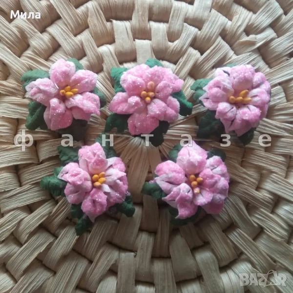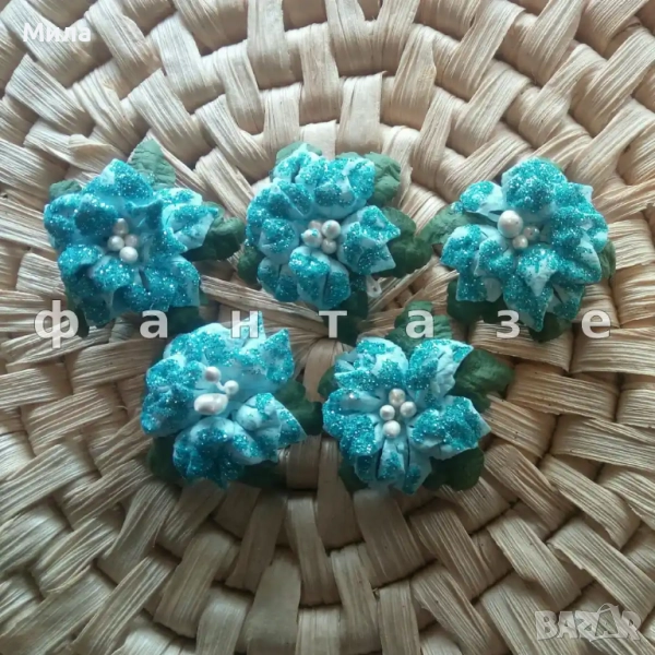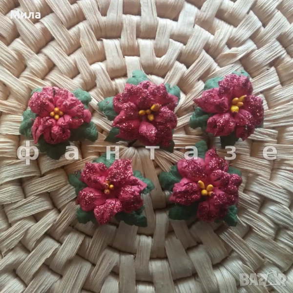 Мини коледни звезди с брокат, изработени от картон. Комплект от 5 броя, размер 3,5 см. Цена 2.50лв. Цветове по желание. Всички налични стоки от тази категория можете да разгледате на фейсбук страницата ни "Фантазе- материали за ръчна изработка" в албума "Цветя, плодчета, мъх" или на нашия уебсайт artmateriali.bg