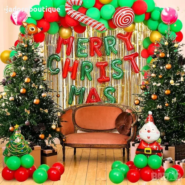 Комплектът съдържа 10 броя златни латексови балони, 60 броя зелени латексови балони, 60 броя червени латексови балони, 4 броя шарени латексови балони, 2 златни завеси, 2 фолиеви балона lollipops, 4 големи фолиеви балони - Дядо Коледа, Елха, Бастунче и Еленче; 1 голям надпис Merry Christmas от фолиеви балони, 1 ролка двойнозалепващи точки, 2 ролки панделки за връзване и 1 пръчица за фолиевите балони.