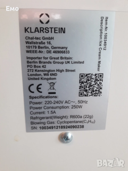 Машина за мек сладолед Кларстейн. 230 волта. 250 вата.