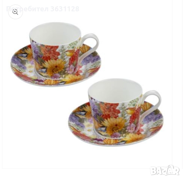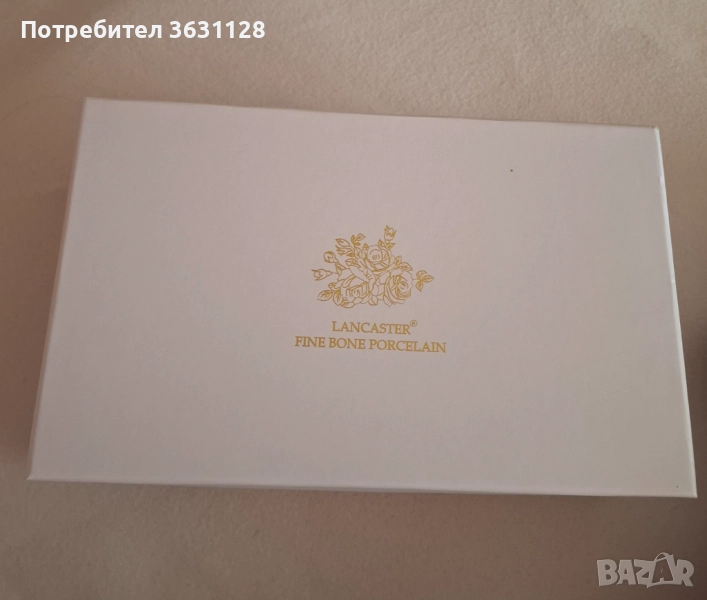 Това е комплект за кафе от фин костен порцелан на марката Lancaster. Комплектът включва две чаши и две чинийки, декорирани с флорални мотиви и птици.