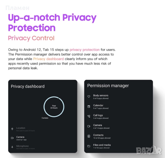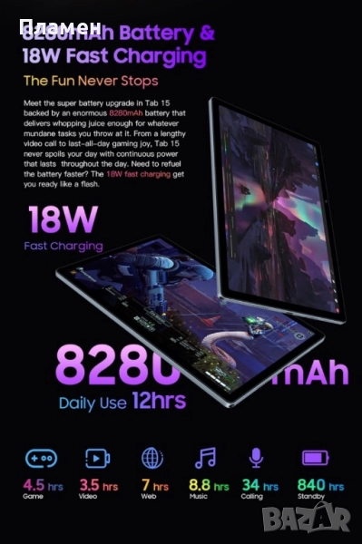 Камерите са с високо качество като основната е 13 MP а предната 8 MP подходящи за снимки видео разговори и онлайн срещи Батерията е с капацитет 8280 mAh и осигурява дълга работа без често зареждане