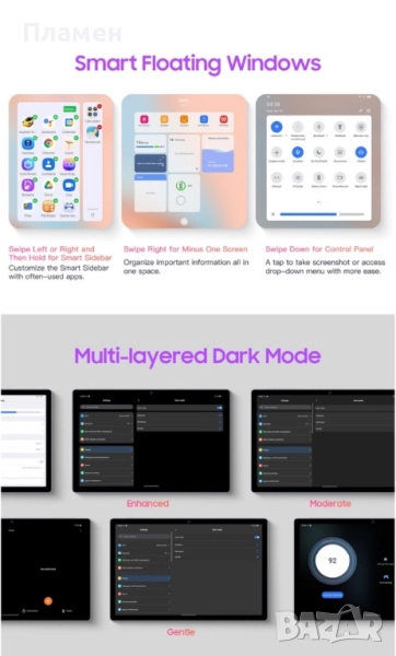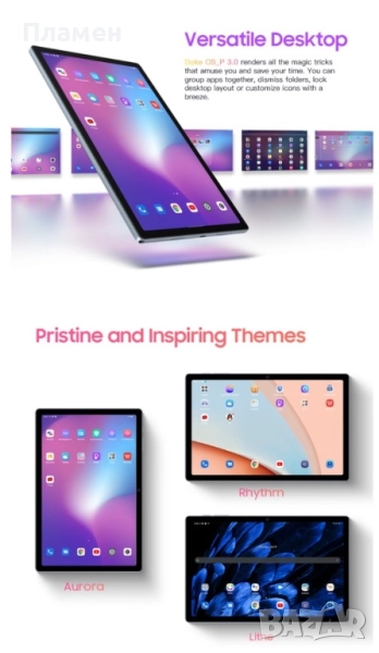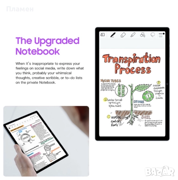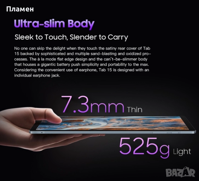 Таблетът има тънък и елегантен метален корпус в сив цвят който придава стилен и професионален вид Подходящ е за ученици студенти професионалисти и всеки който търси надежден таблет с голям екран висока производителност и издръжлива батерия