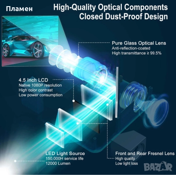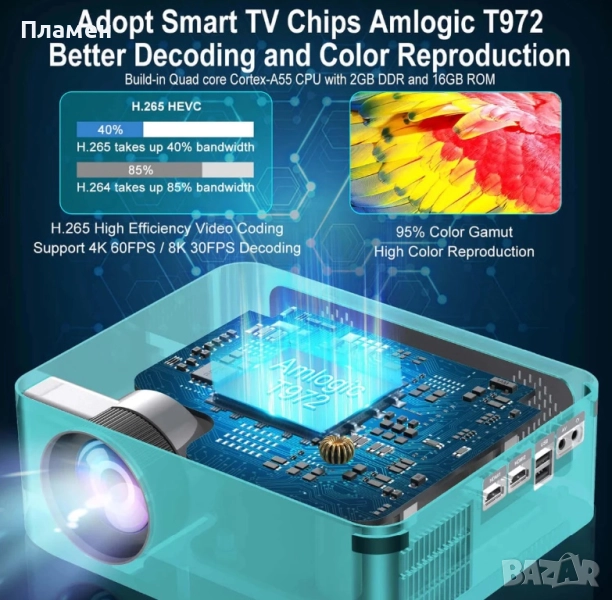 Проекторът е лесен за инсталиране и настройка поддържа HDMI USB и аудио портове което го прави съвместим с различни устройства Подходящ е за използване у дома на вилата или навън при вечерни прожекции