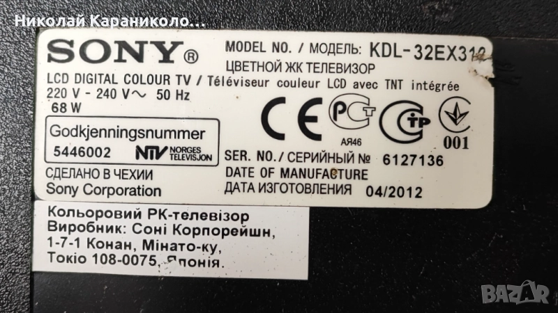 Продавам тв SONY KDL-32EX310 за части по причина-счупена матрица/LC320EXN/SD/A3/.Редовни съответно: