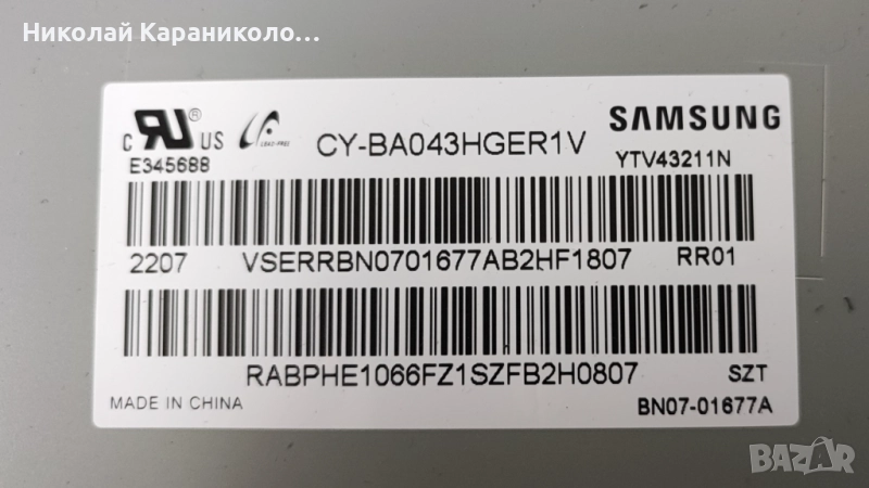 Продавам тв SAMSUNG UE43AU7172U за части по причина-счупена матрица/CY-BA043HGER1V/.Редовни съответно: