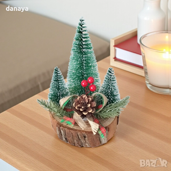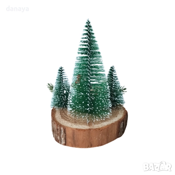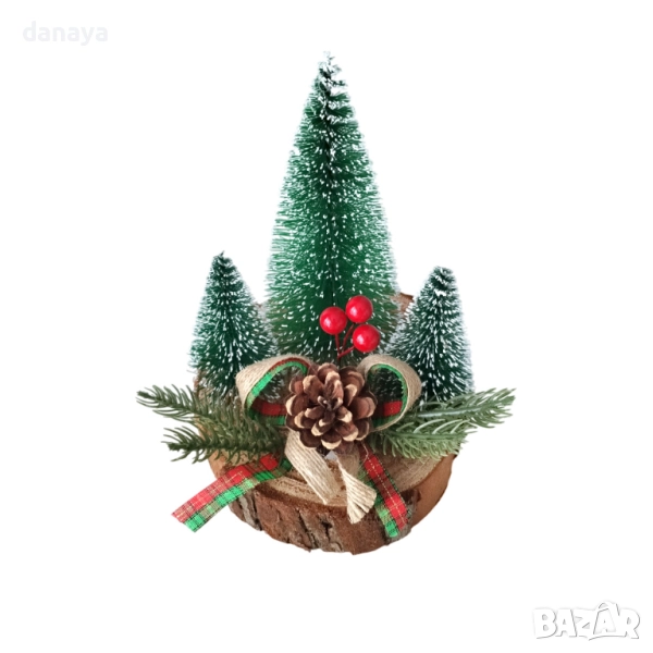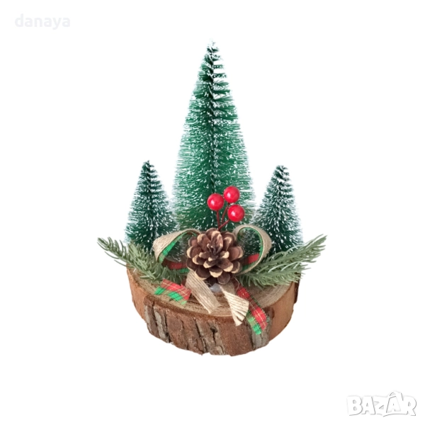 Добавете коледен уют и топлина у дома с тази красива коледна декорация с елхички върху дървено пънче. Композицията включва три заснежени мини елхички, украсени с шишарка, клонки и панделка в празнични цветове.