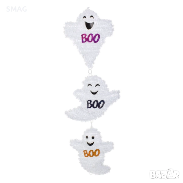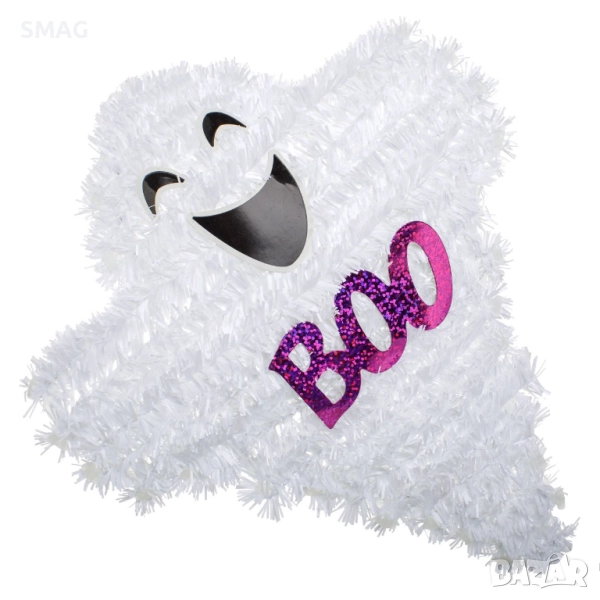 Висяща декоративна композиция за Halloween / Хелоуин с духчета от бял Tinsel, които светят в тъмното. Идеална за врати, прозорци или като акцентна декорация за парти или домашна украса.