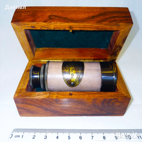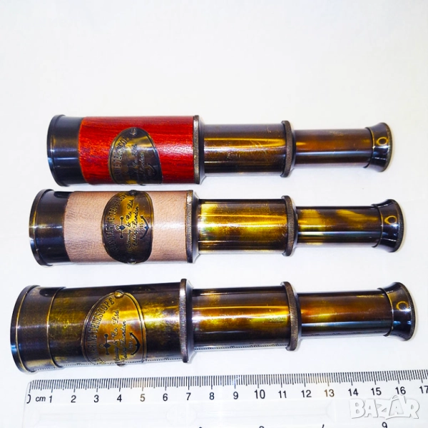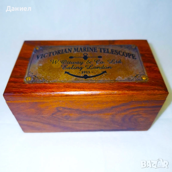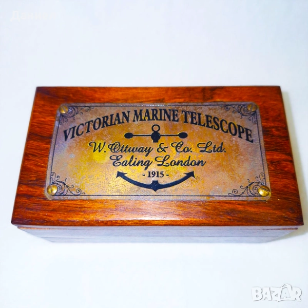 Далекогледът е изработен от масивен бронз и се предлага в стилна дървена кутия с ретро дизайн, която придава допълнителен чар и изисканост. Подходящ е както за уникален подарък, така и за интериорна декорация – идеален за любители на морската тематика, колекционери или просто за тези, които обичат нестандартни аксесоари с история.