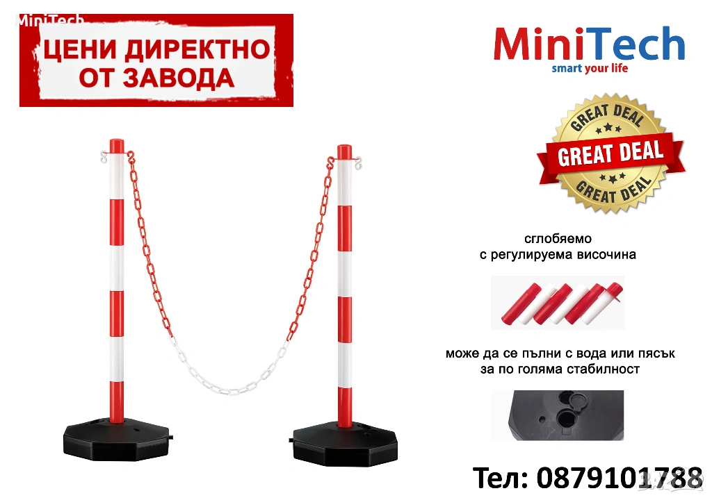 Практично и надеждно решение за ограничаване на достъп, сигнализация и организация на движението. Подходящо за паркинги, училища, строителни и търговски обекти, обществени пространства и частни имоти.